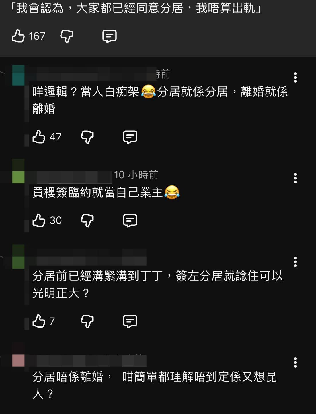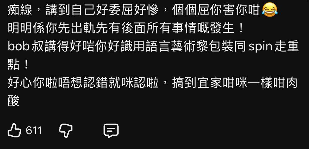 有網民從法律角度分析指出「未正式離婚都唔叫出軌 你同法律唱反調架?」,質疑他對分居協議的解釋。另有網民留言「在香港和英國,即使簽署了分居協議,在正式離婚令生效前,法律上仍屬婚內狀態。與他人發生關係通常被視為『不忠』」,直接反駁他「分居就不算出軌」的說法。網民普遍認為他試圖用法律條文為自己開脫,但實際上曲解了法律條文的真正含義。
