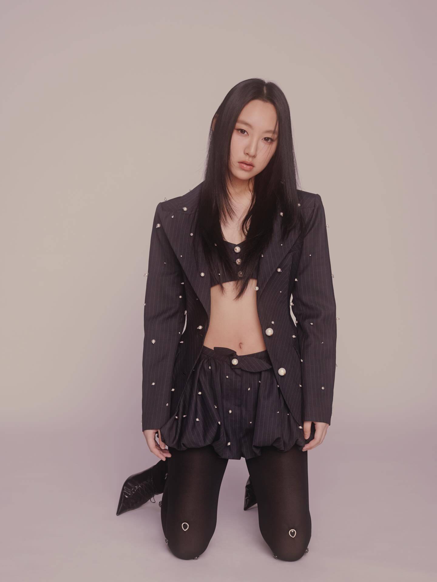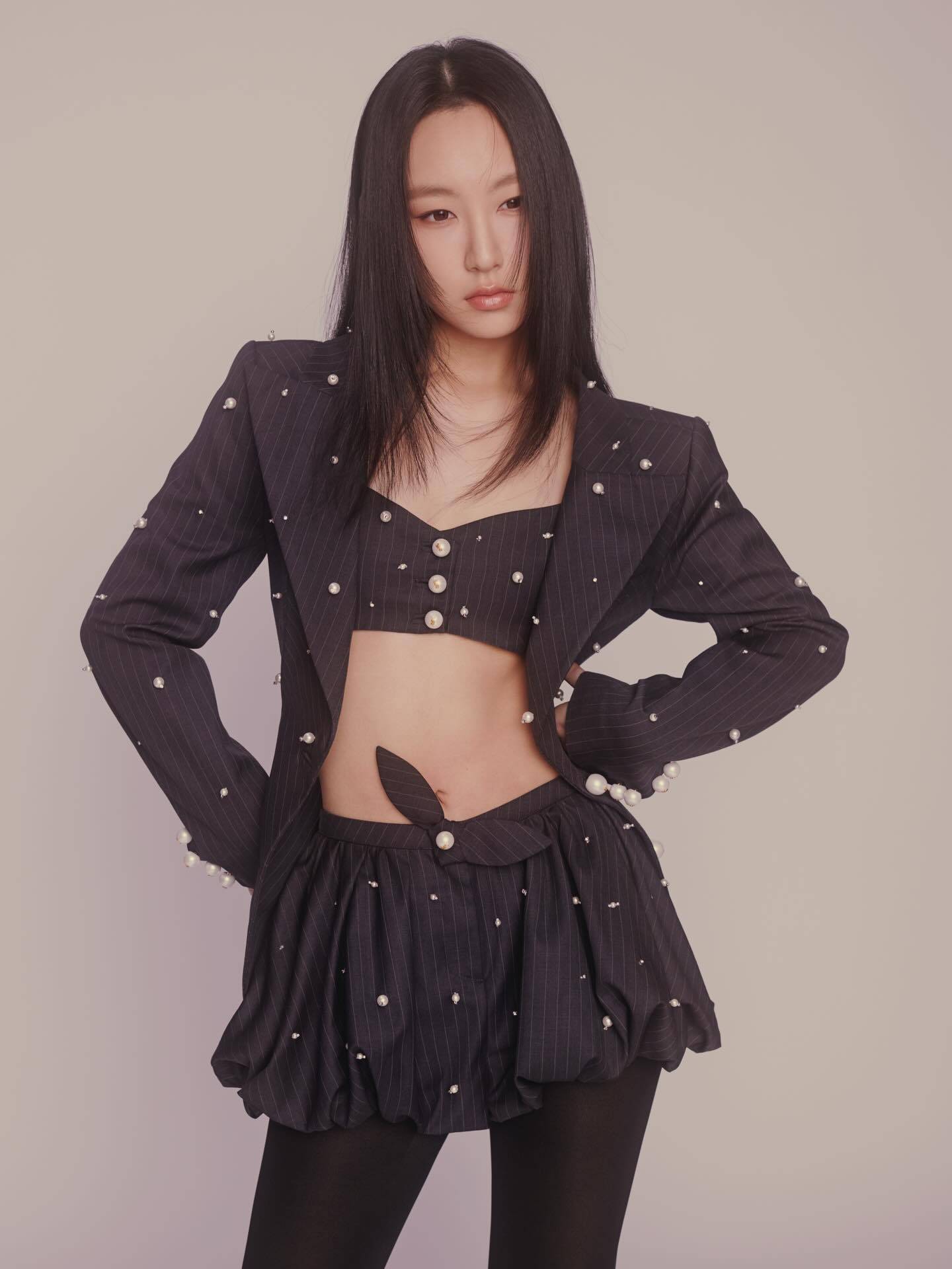 炎明熹今次的性感造型相當引人注目,身穿一套黑色直紋西裝套裝搭配白色波點,設計獨特而大膽。內搭的超短身上衣及內衣完美展現她纖細的腰身和腹部線條,下身則配襯同系列的超短泡泡裙,搭配神秘的黑色絲襪及高跟鞋,令她的修長美腿無比搶眼。整體造型不僅時尚,也充滿了吸引力,完全擺脫了出道初期的稚氣形象。