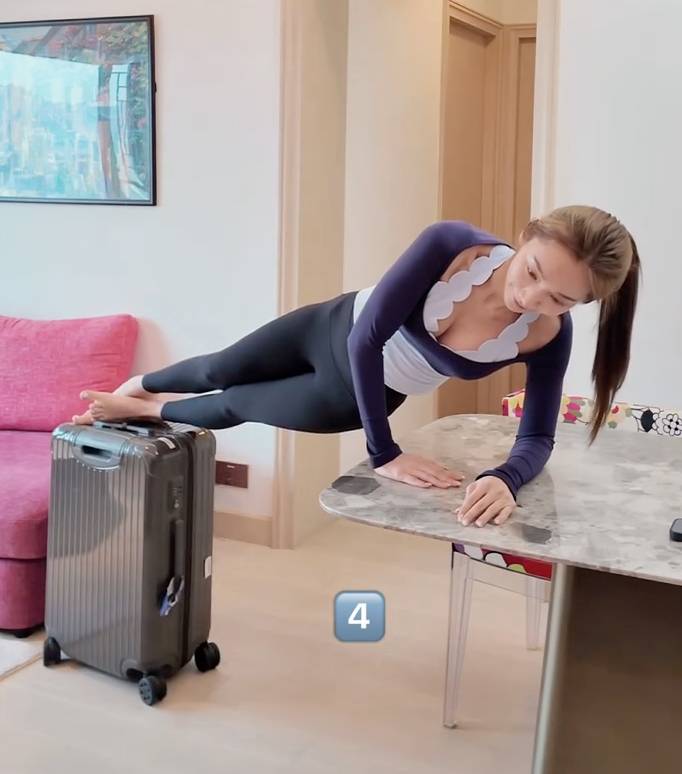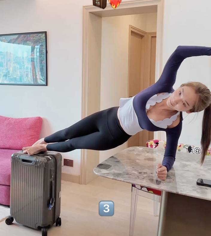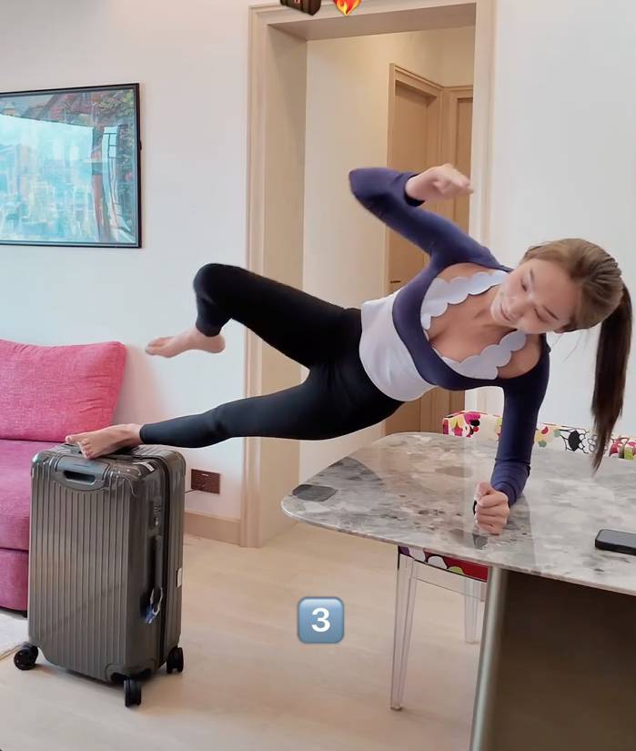 王嘉慧在短片中寫道:「Home🏠vs Gym🏋🏻♀️⚠️危險動作切勿模仿」,片中她穿著貼身運動裝,雙手按在餐桌上,雙腳踏在行李箱,借助行李箱的滾輪做出多個平板支撐動作,更有靠單腳、單手的高難度動作。雖然她動作看似平穩,但在餐桌與行李箱上做運動,令人看得心驚膽跳,擔心她稍一不慎失手、反桌或跌倒受傷。短片中亦意外曝光了她西九龍豪宅的客廳內景,空間寬敞,裝潢豪華。