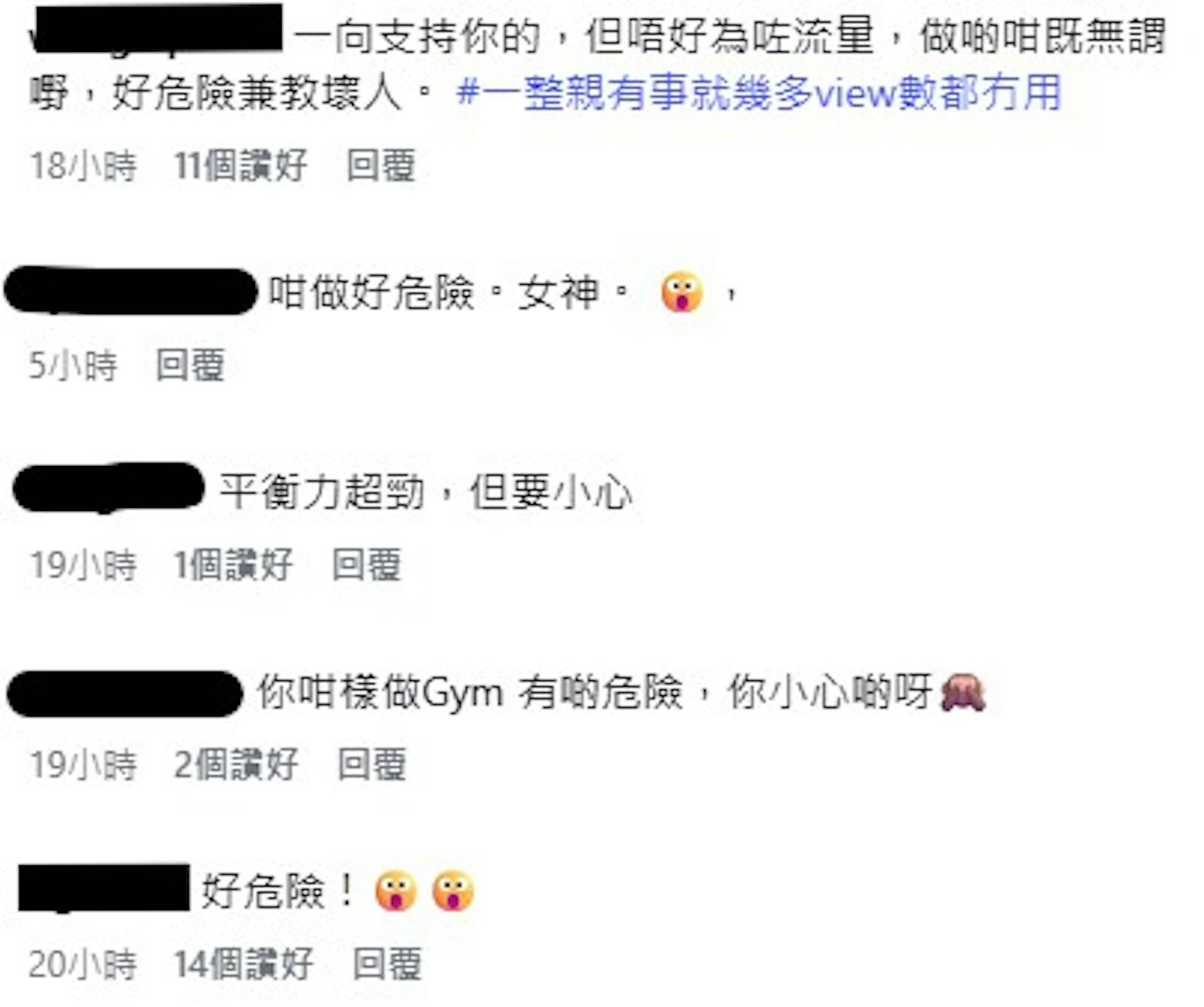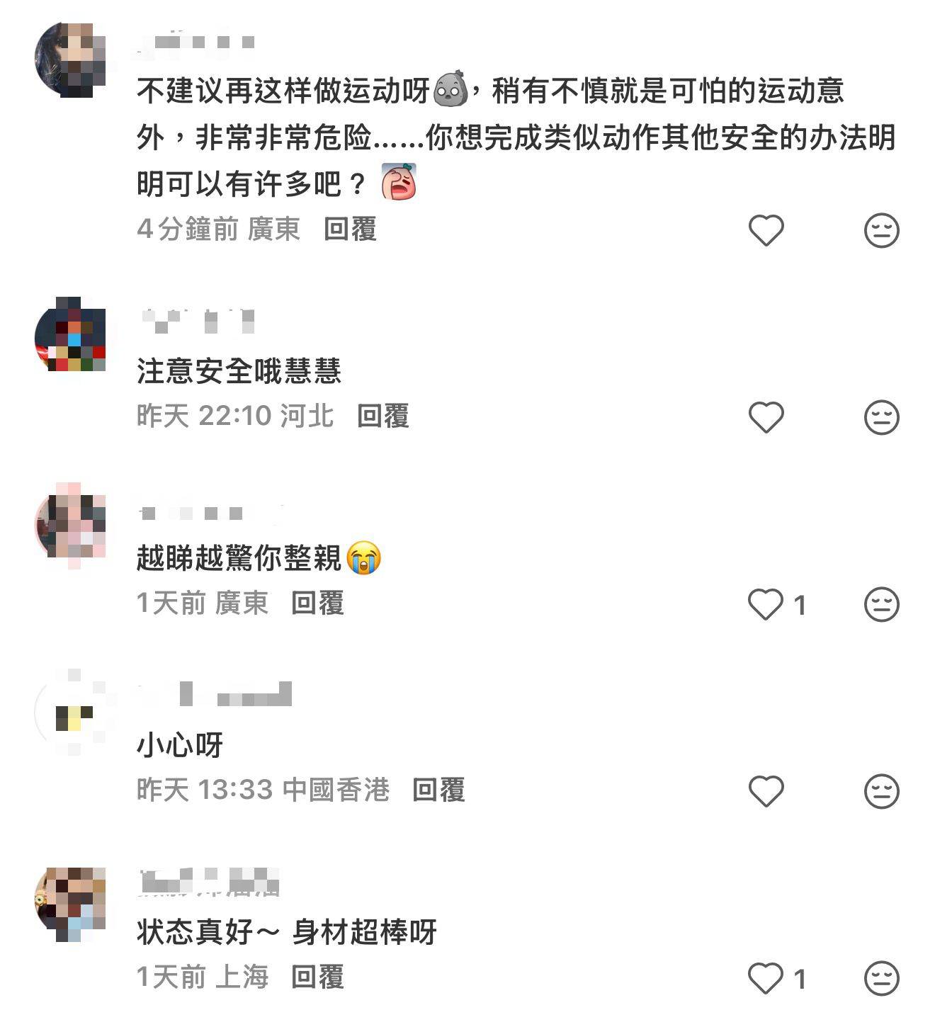 面對網民的擔憂,王嘉慧在貼文中已特別提醒「危險動作切勿模仿」,並用英文補充「don’t try this at home unless you know what you’re doing」,顯示她明白動作的危險性。她擁有健身教練專業資格,對運動訓練有一定認識,但仍然在貼文中提醒大家不要輕易模仿。不過即使有專業背景,網民仍然為她的安全擔心,認為在家具上做運動始終存在風險。