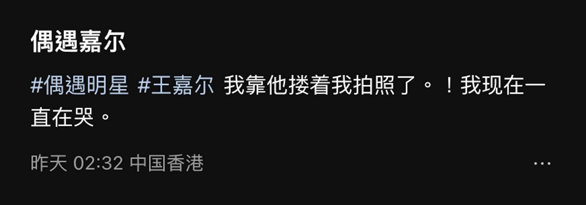 原來令女粉絲情緒失控的並非什麼負面事件,而是王嘉爾的「親密舉動」令對方喜極而泣!該名女粉絲事後在社交平台激動分享:「我X,他摟著我拍照了!我現在一直在哭。」從她的用詞可見當時有多興奮,連粗口都爆埋出嚟。她更詳細描述當時情況,表示由於自己很社恐,所以由朋友代為上前詢問能否合照,結果王嘉爾不但答應,更親自出來與她們拍照,態度超級好又平易近人。