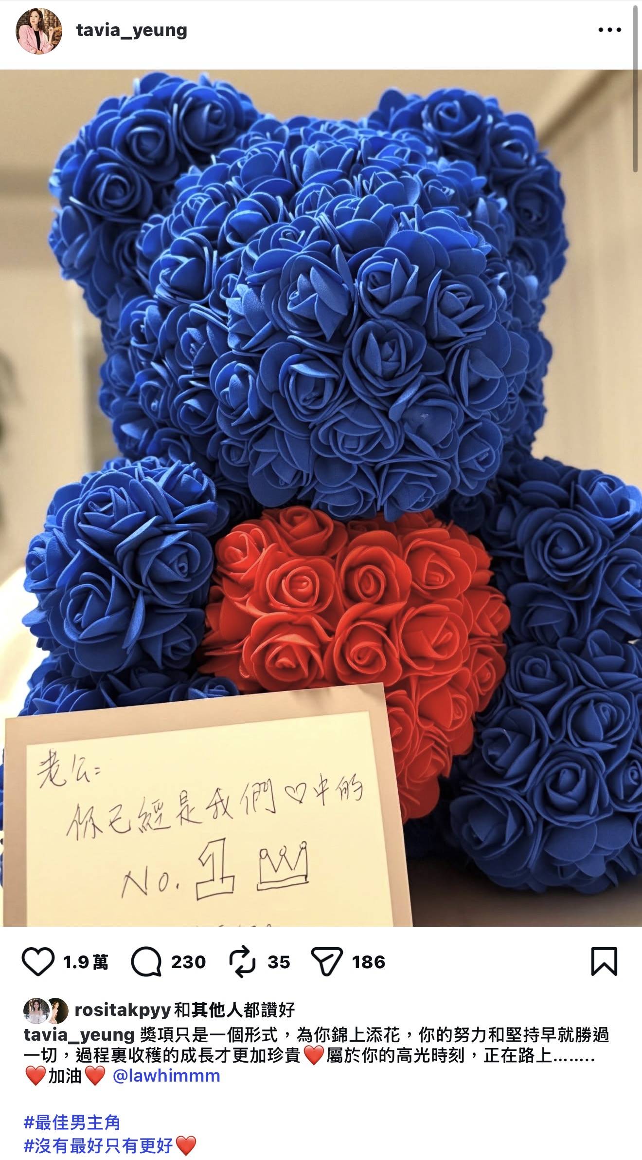 雖然老公未能獲獎,但「視后」太太楊茜堯當然第一時間送上安慰。她在社交平台貼出一張相當溫馨的照片,相中有一隻由藍紅玫瑰組成的熊仔抱著一個心心造型的公仔,並附上一張楊茜堯親筆寫的心意卡,上面寫道:「老公你已經是我們心中的No.1」,更畫上皇冠圖案,認真Sweet爆!這份貼心的安排充分展現了她對丈夫的無限支持和愛意。