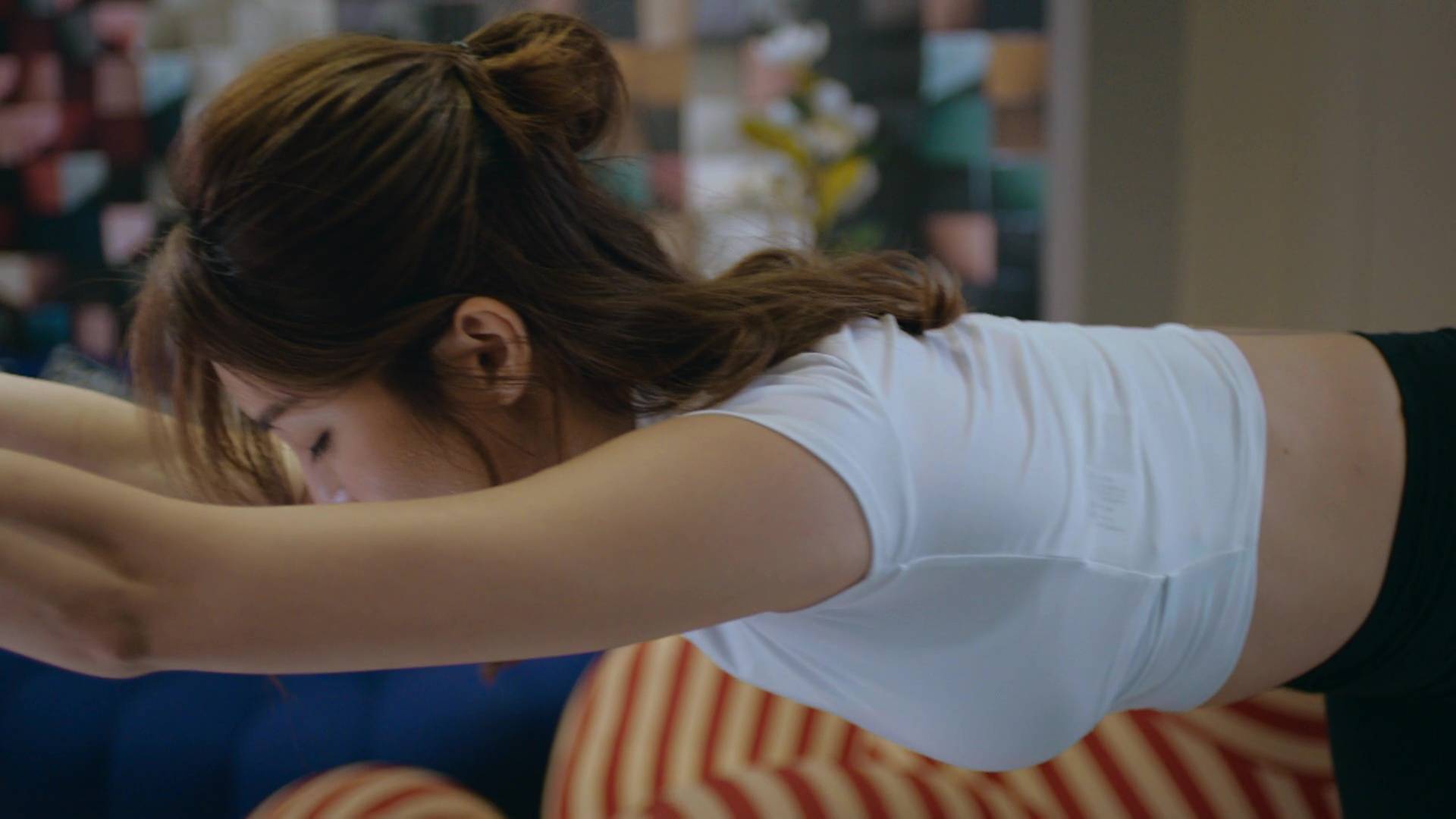 在昨晚播出的劇情中,張曦雯(Kelly)飾演的角色與黃子恆在家中上演一幕甜蜜互動。畫面所見,Kelly身穿極度貼身的瑜伽套裝,展現其招牌「Gfable式甜笑」,並主動坐在黃子恆的大脾上甜蜜談情,二人更情到濃時深情咀嘴,女人味大爆發,畫面充滿粉紅泡泡,極度吸睛。不過,最令網民震驚的是,即使Kelly穿著如此貼身的瑜伽褲並做出高難度的坐姿,其腰間及腿部線條依然完美,完全沒有一絲贅肉被擠出,體態控制力驚人,令人佩服。