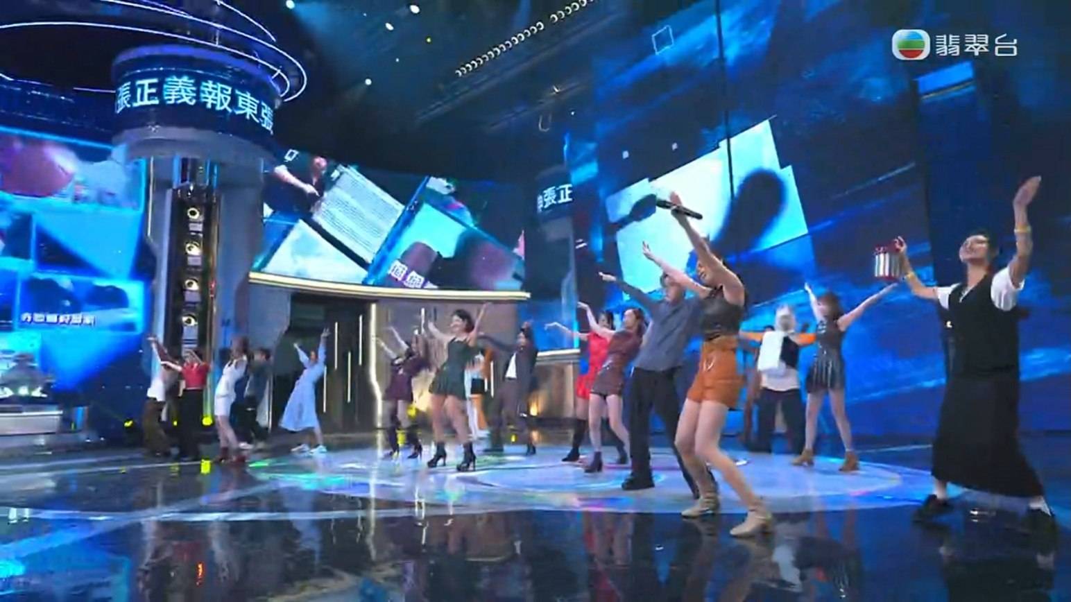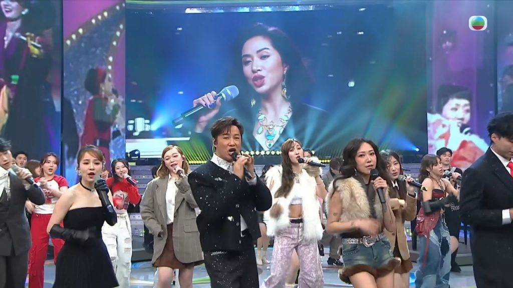 AI梅姐跟足嘴型與一班後輩同場合唱。(圖片來源:TVB)