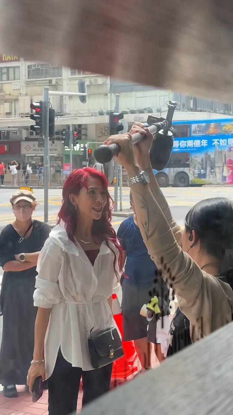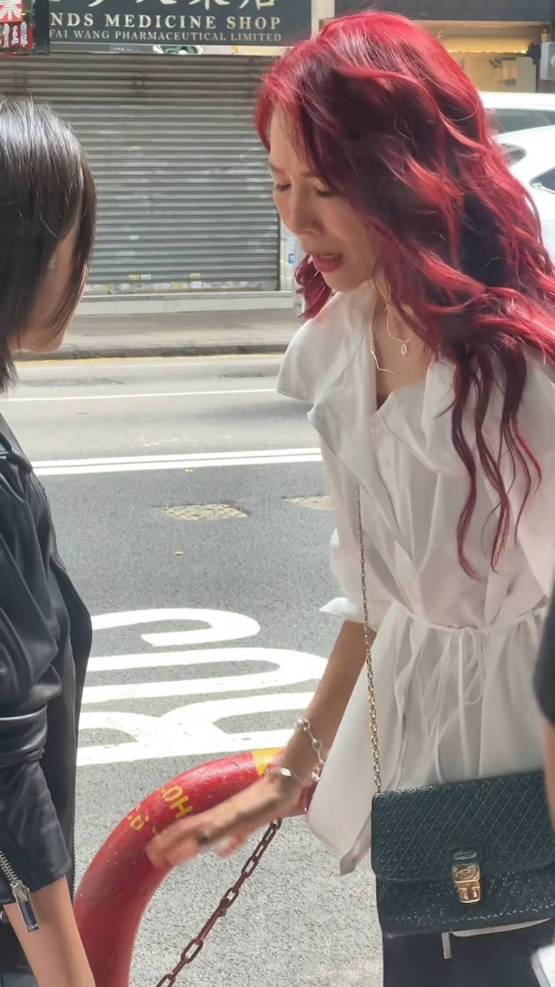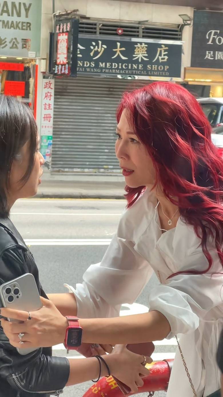 有網民以「誰懂一出門就看到蔡少芬在拍攝的感覺」為題,興奮分享偶遇片段。畫面中可見,蔡少芬一頭紅色曲髮,身穿白色長襯衫配搭黑色闊腿褲,造型幹練十足。儘管現場吸引不少途人駐足圍觀,但她完全沒有受到環境影響,全情投入角色演繹。片段顯示她正與蘇麗珊上演一幕激烈的爭論戲,捉實對方手臂的動作配合眼神變化,短短幾秒已展現出豐富的情緒層次。