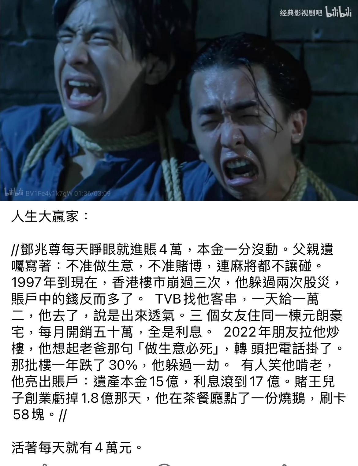 內地網紅近日瘋傳鄧兆尊的「躺平」致富傳奇,聲稱他1997年繼承父親新馬師曾15億遺產後,嚴格遵守父親遺囑「不准做生意、不准賭博、連麻將都不讓碰」的教誨,單靠收息過活。傳聞更指他成功躲過香港樓市三次崩盤和兩次股災,賬戶資金不跌反升至17億元。按此計算,他每年約有3,300萬利息收入,即每月240萬、每日4萬元的驚人進賬,連TVB找他客串一日1萬2千元酬勞,他都說是「出來透氣」。