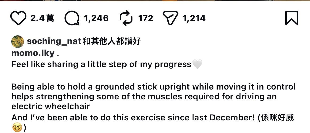值得關注的是,早前因在Instagram個人簡介中移除阿Mo帳號而引發分手疑雲的So Ching,昨晚再次為阿Mo的代禱信按讚打氣。自分手傳聞爆發以來,So Ching一直有為阿Mo的近況更新按讚,包括今年2月阿Mo分享電動輪椅練習短片時,她同樣給予支持。這個舉動令外界猜測,二人關係或許並非如外界想像般決裂,反而可能正在低調維持聯繫。