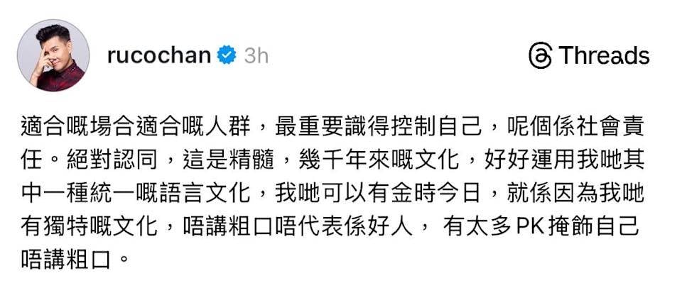 陳展鵬在轉發時更加碼發表個人見解,直言「適合嘅場合適合嘅人群,最重要識得控制自己,呢個係社會責任。絕對認同,這是精髓,幾千年來嘅文化,好好運用我哋其中一種統一嘅語言文化,我哋可以有今時今日,就係因為我哋有獨特嘅文化,唔講粗口唔代表係好人,有太多PK掩飾自己唔講粗口。」他更強調粗口是幾千年來的文化,認為香港能有今時今日的成就,正是因為擁有獨特的文化。