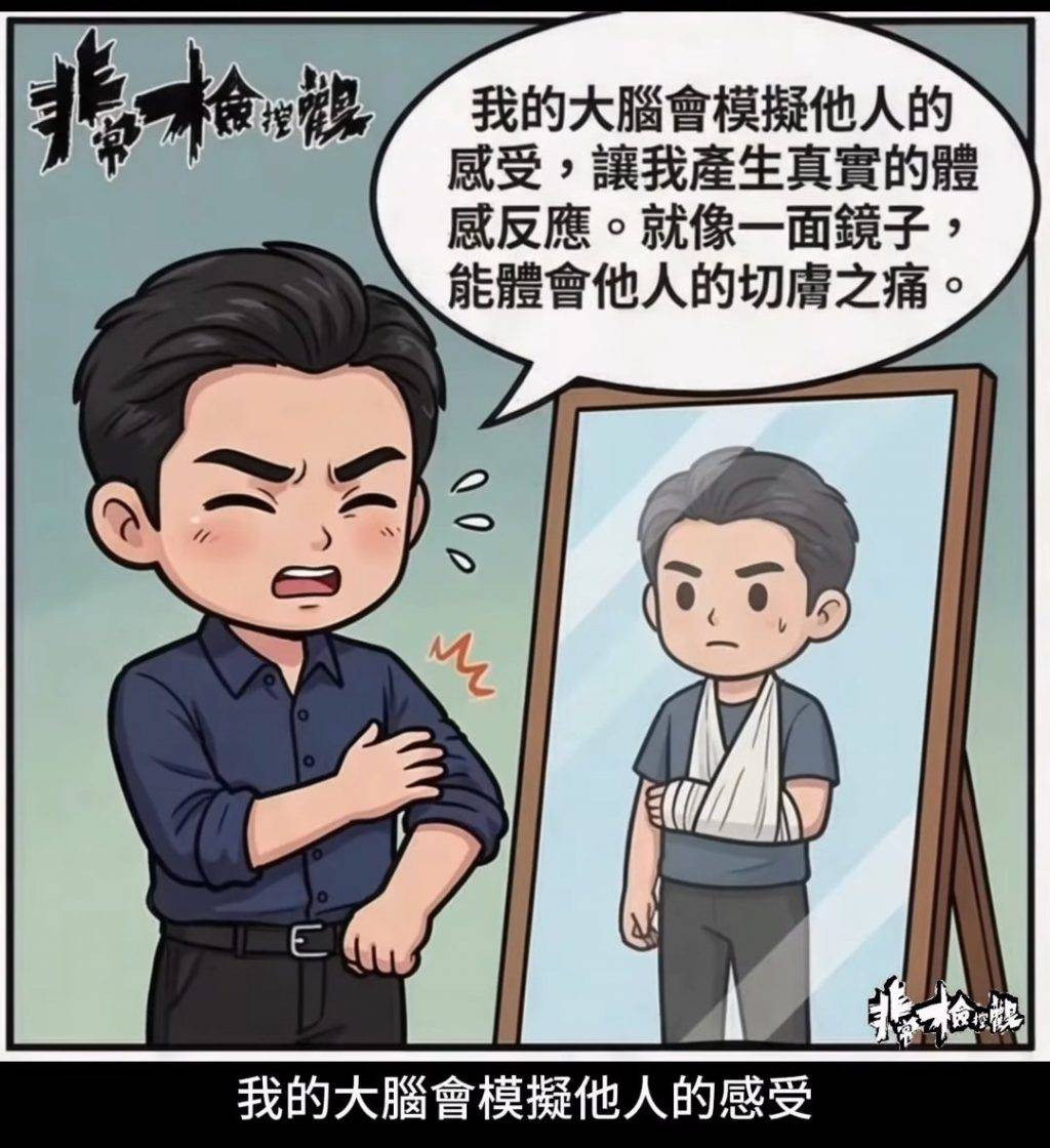 馬德鐘 鏡反射觸覺症 非常檢控觀 從醫學角度而言,鏡反射觸覺症(Mirror-Touch Synesthesia,簡稱MTS)屬於「聯覺」的一種形式,是指一種感官刺激會自動引發另一種感官體驗的現象。患者觀察到他人被觸碰時,大腦的鏡像神經元系統會異常活躍,將「看到」的觸摸轉化為自身真實的感覺。(圖片來源:TVB)