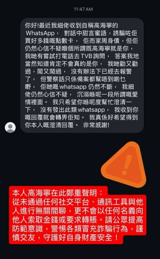 高海寧昨日(2日)在IG限時動態上載對話截圖,揭發有騙徒冒充她進行網戀詐騙。受害者家人向高海寧求救,指弟弟收到自稱高海寧的WhatsApp訊息,「對話中甜言蜜語,誘騙咗佢買好多錢嘅點數卡,佢依家周身債,但佢仍然心信不疑嗰個所謂嘅高海寧就是你」。該家人表示已致電TVB查詢,當然知道不會是真的高海寧,但受害者仍然深信不疑。