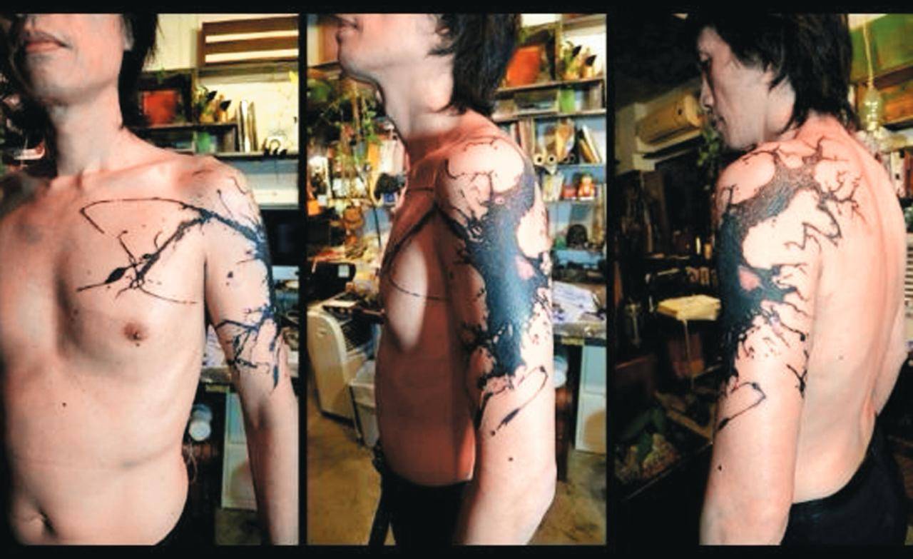 據知子華神這個潑墨紋身大有來頭!有傳當年他與拍拖10年的化妝師女友溫安妮分手後,找了以香港為基地的法國紋身師Leon Lam Hien操刀。Leon是ALCHEMINK SCIENCES香港紋身工作室的成員之一,擅長不規則及割線式潑墨風格,講求意境和隨心所欲的創作理念。這個看似沒有構圖的抽象作品,其實在比例上都相當細緻,每一條線條都經過精心設計,構成一幅充滿藝術感的抽象畫。