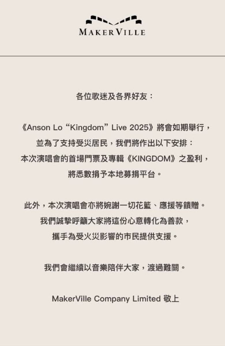 MakerVille在聲明中表示「各位歌迷及各界好友:《Anson Lo “Kingdom” Live 2025》將會如期舉行,並為了支持受災居民,我們將作出以下安排」,正式確認演唱會將按原定計劃進行。公司強調「我們誠摯呼籲大家將這份心意轉化為善款,攜手為受火災影響的市民提供支援」,希望將原本用於應援的資源轉為實際幫助。聲明最後以「我們會繼續以音樂陪伴大家,渡過難關」作結,展現出藝人與粉絲共度時艱的決心。