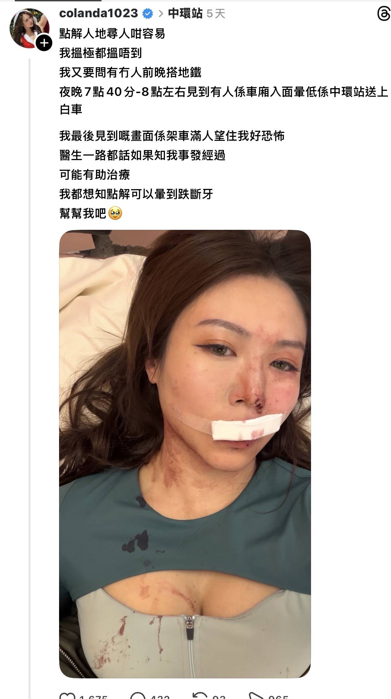 港女網紅Colanda繼前年做facial意外險盲後,近日再遭厄運纏身。她在地鐵車廂內突然抽搐暈倒,臉部重重撞地導致兩隻門牙當場斷裂,鮮血染紅車廂地板,驚嚇眾多乘客四散逃離。事後她在社交平台發布滿臉血跡的照片求助,希望尋找目擊者協助查明暴病原因,畫面令人觸目驚心。