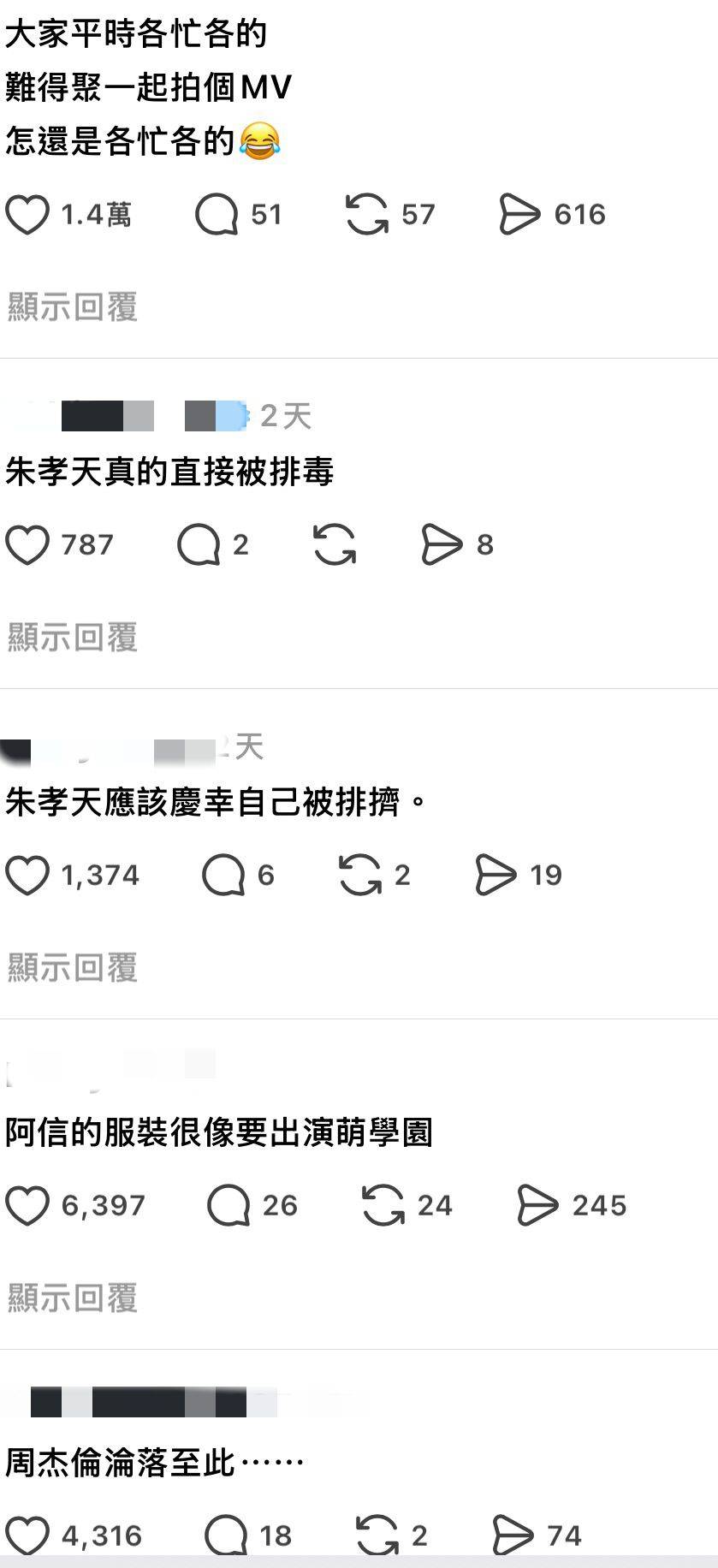 朱孝天不僅無份參與新歌合唱,更是完全從MV的所有F4相關畫面中消失,彷彿從未存在過一般。這個安排證實了早前朱孝天因多次在直播中爆料而被團隊除名的傳聞,並由五月天主唱阿信取代其位置。網民對此現象感到驚訝,有人留言表示「被除名了……真淒涼,好像完全不曾存在過一樣」,亦有網民幽默地說「朱孝天跟我都在家裡看MV」,甚至開玩笑稱「朱孝天:缺一個我,要找兩個天王來頂」。