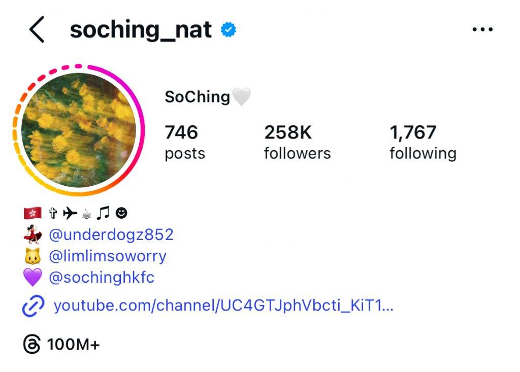 網民發現So Ching在Instagram自我介紹一欄中,移走了原本附有黃色心心圖案的阿Mo帳戶連結。此外,她的置頂影片亦有所調整,原本置頂的三條與阿Mo跳舞片段,現在只保留一條,其餘兩條則換成她在西班牙的旅遊照片及在排舞室跳舞的片段。不過在追蹤名單上,仍可見到阿Mo的名字,顯示二人並未完全斷絕聯繫。
