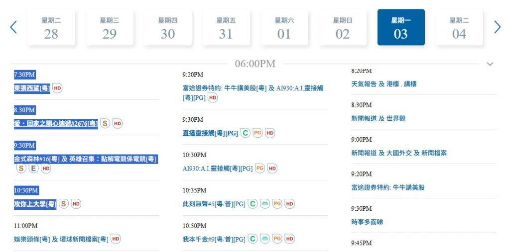 根據TVB官方網頁的節目表顯示,下星期一11月3日起將會實施特別調動安排。《東張西望》將會由晚上7點半起播放1小時,比平常延長30分鐘。原定晚上8點播出的處境劇《愛回家之開心速遞》將會順延至晚上8點半起播放1小時,每次播放兩集,接著再由《金式森林》繼續晚上9點半檔播放。這個安排意味著台慶月第一星期只有兩部劇集在黃金時段播出。