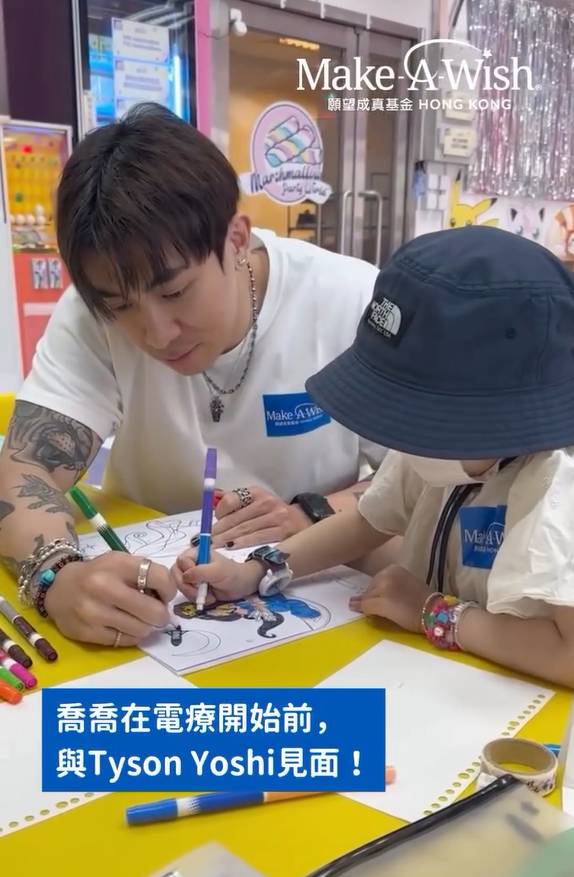 願望成真基金團隊精心安排,讓Tyson Yoshi在充滿童趣的室內遊樂場與喬喬見面。平日形象冷酷的Tyson一出場,喬喬即刻心心眼,兩人在色彩繽紛的波波池中嬉戲玩樂。Tyson更化身最溫柔的大哥哥,耐心陪喬喬串珠仔手鏈、一起拿起畫筆塗顏色,笑聲與色彩填滿整個空間。見面期間,Tyson還親自拍片鼓勵喬喬:「喬喬,加油努力!希望好快見面啦!」為她注入更多勇氣面對治療。