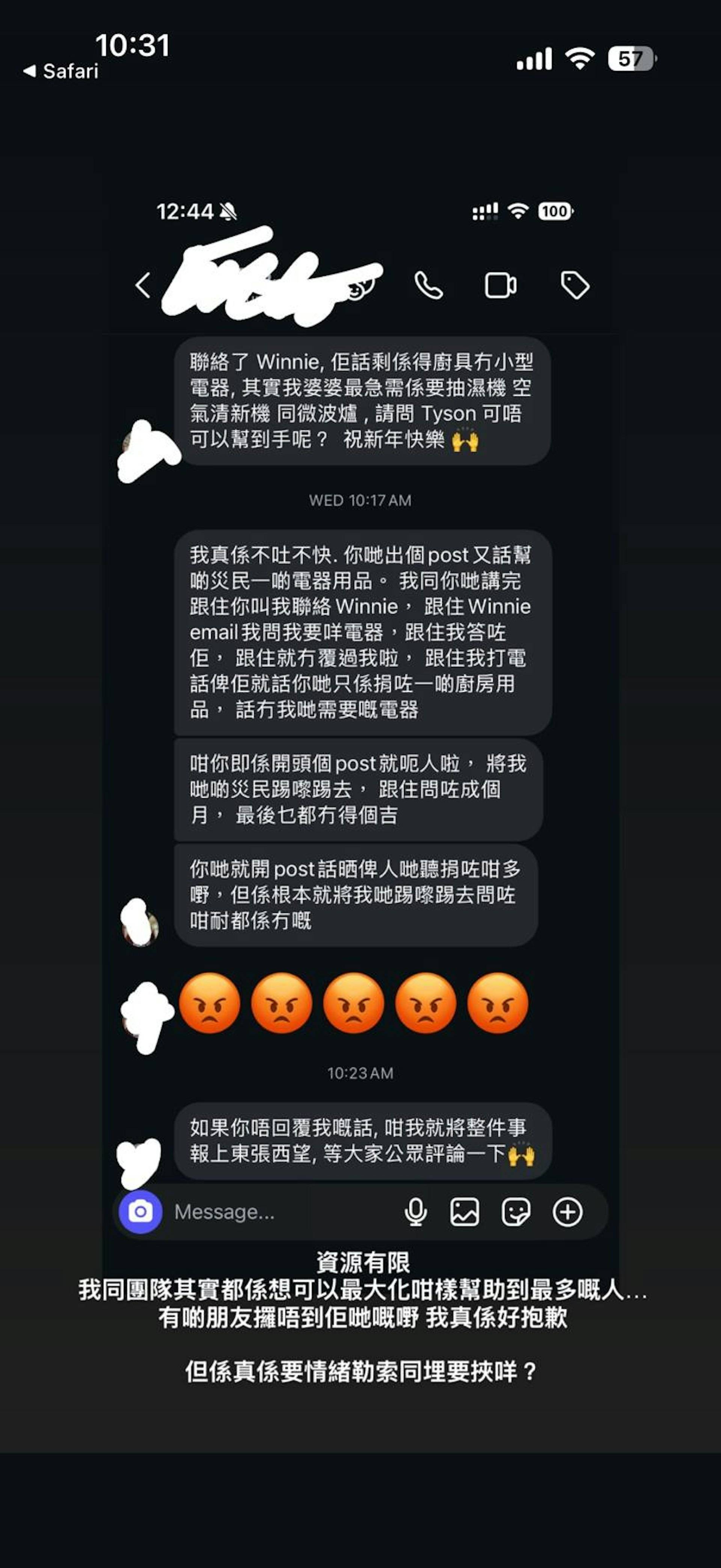 事緣有災民家屬因未能取得所需電器而在私訊中表達強烈不滿。該網民在訊息中抱怨聯絡了Tyson團隊的Winnie後,被告知「剩係得廚具冇小型電器」,但其婆婆最急需的抽濕機、空氣清新機和微波爐卻無法提供。該網民情緒激動地指控:「咁你即係開頭個post就呃人啦,將我哋啲災民踢嚟踢去,跟住問咗成個月,最後乜都冇得個吉。」更進一步狠批Tyson團隊「根本就將我哋踢嚟踢去問咗咁耐都係冇嘅」,令人感受到災民家屬的無助和憤怒。
