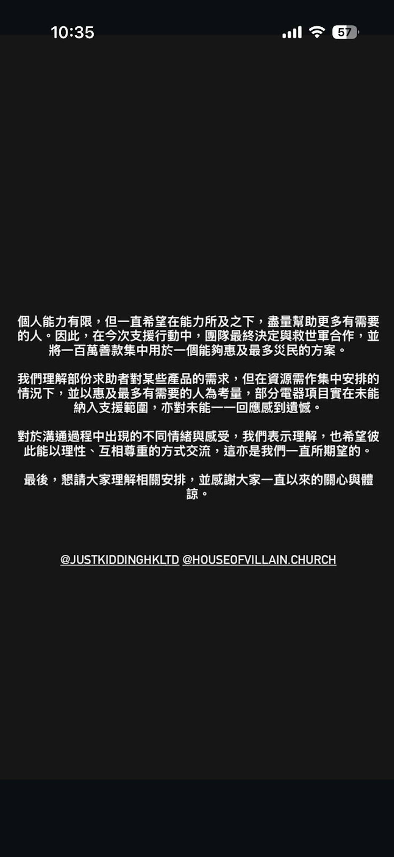 其後,Tyson Yoshi的團隊於Instagram Story發出正式聲明,詳細解釋今次支援行動的安排。聲明指出:「個人能力有限,但一直希望在能力所及之下,盡量幫助更多有需要的人。因此,在今次支援行動中,團隊最終決定與救世軍合作,並將一百萬善款集中用於一個能夠惠及最多災民的方案。」團隊承認理解部份求助者對某些產品的需求,但在資源需作集中安排的情況下,並以惠及最多有需要的人為考量,部分電器項目實在未能納入支援範圍。