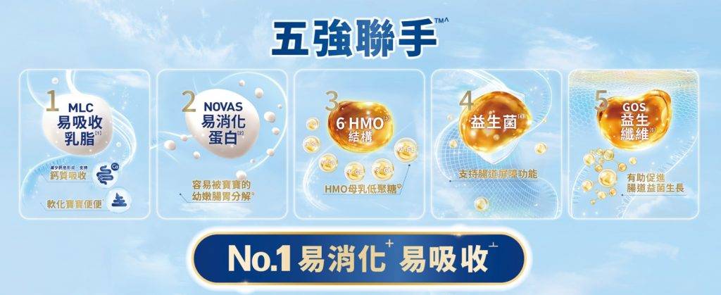 ^ 指 MLC 易吸收乳脂、NOVAS 易消化蛋白、 6 HMO 母乳低聚糖結構、GOS 益生纖維及 HN019 益生菌。