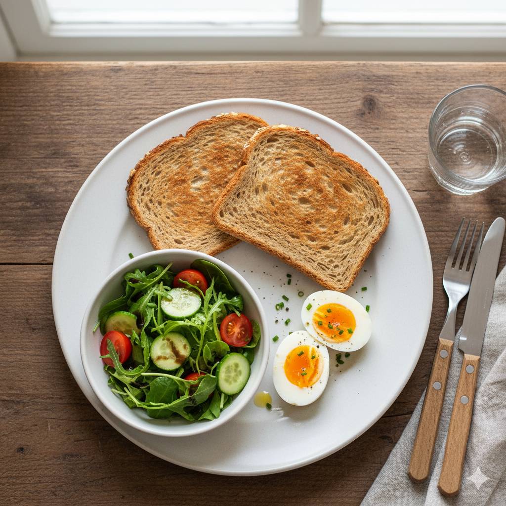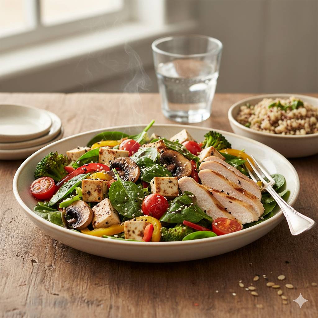 雜菜湯或溫熱沙律(配豆腐/瘦肉)+少量全穀類