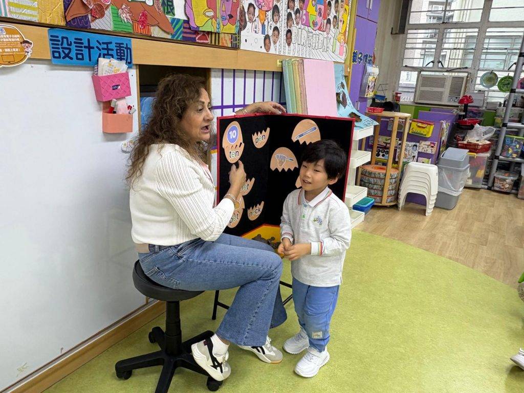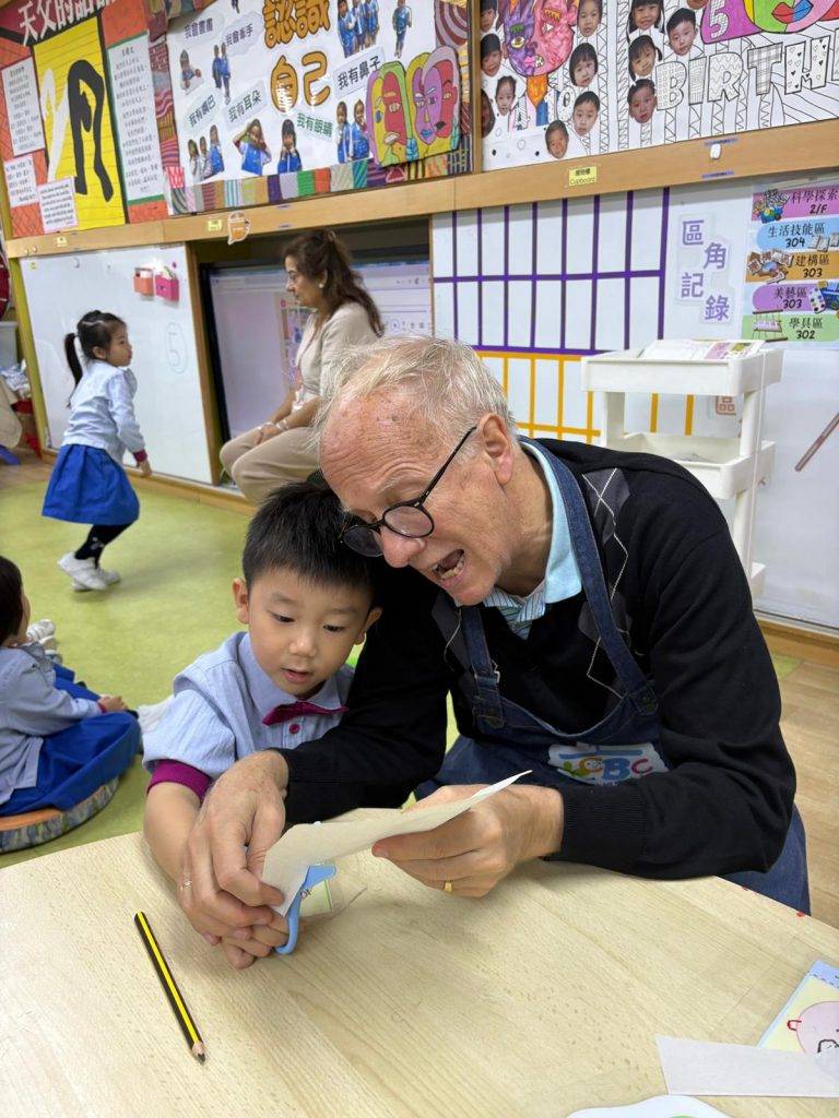 小一選校 英語老師與幼兒一起進行小肌肉活動——剪紙(圖片來源:學校提供)