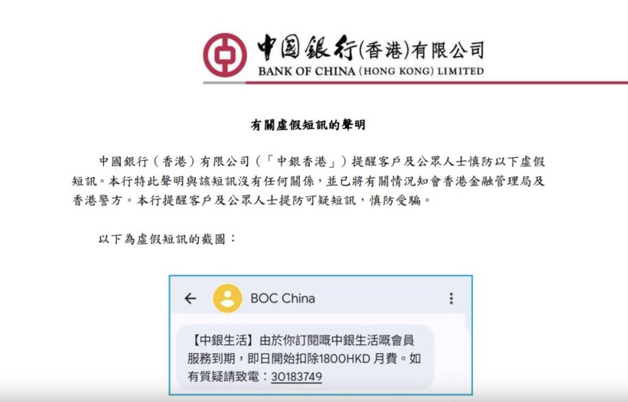 中銀香港迅速發出聲明,強調銀行與相關詐騙短訊沒有任何關係,並呼籲公眾提防可疑短訊。銀行指出,官方已參與「短訊發送人登記制」,所有正式短訊發送人名稱均以「#」號開頭,包括「#BOCHK」、「#BOCHK_TXN」、「#BOCHK_CC」等。市民收到短訊時應仔細核實發送人名稱,如有懷疑應直接聯絡銀行查證。