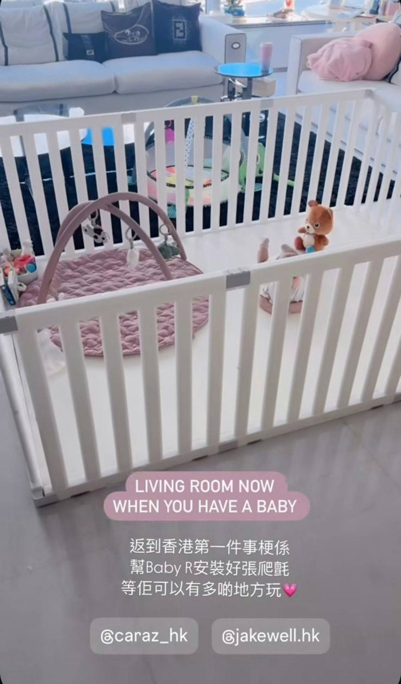 從何依婷在Instagram限時動態分享的片段中,可以清楚看到她們居住的豪宅客廳以簡潔白色為主調,採光極為充足。寬闊的空間內不僅擺放了兩張舒適沙發、地毯和茶几,更同時容納了囡囡專用的安全圍欄和柔軟爬行地墊。客廳一旁還放置了按摩椅和寵物用品,然而四周依然顯得非常鬆動開揚,足以證明這個單位的空間規模相當驚人。