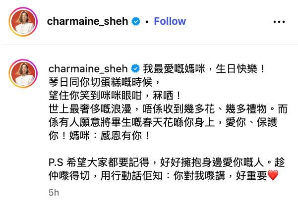 最後她寄語大家要珍惜眼前人,「希望大家都要記得,好好擁抱身邊愛你嘅人。趁仲嚟得切,用行動話佢知:你對我嚟講,好重要」, 最後更打了一個紅色心心符號,一班圈中好友也為佘媽媽送上祝福。