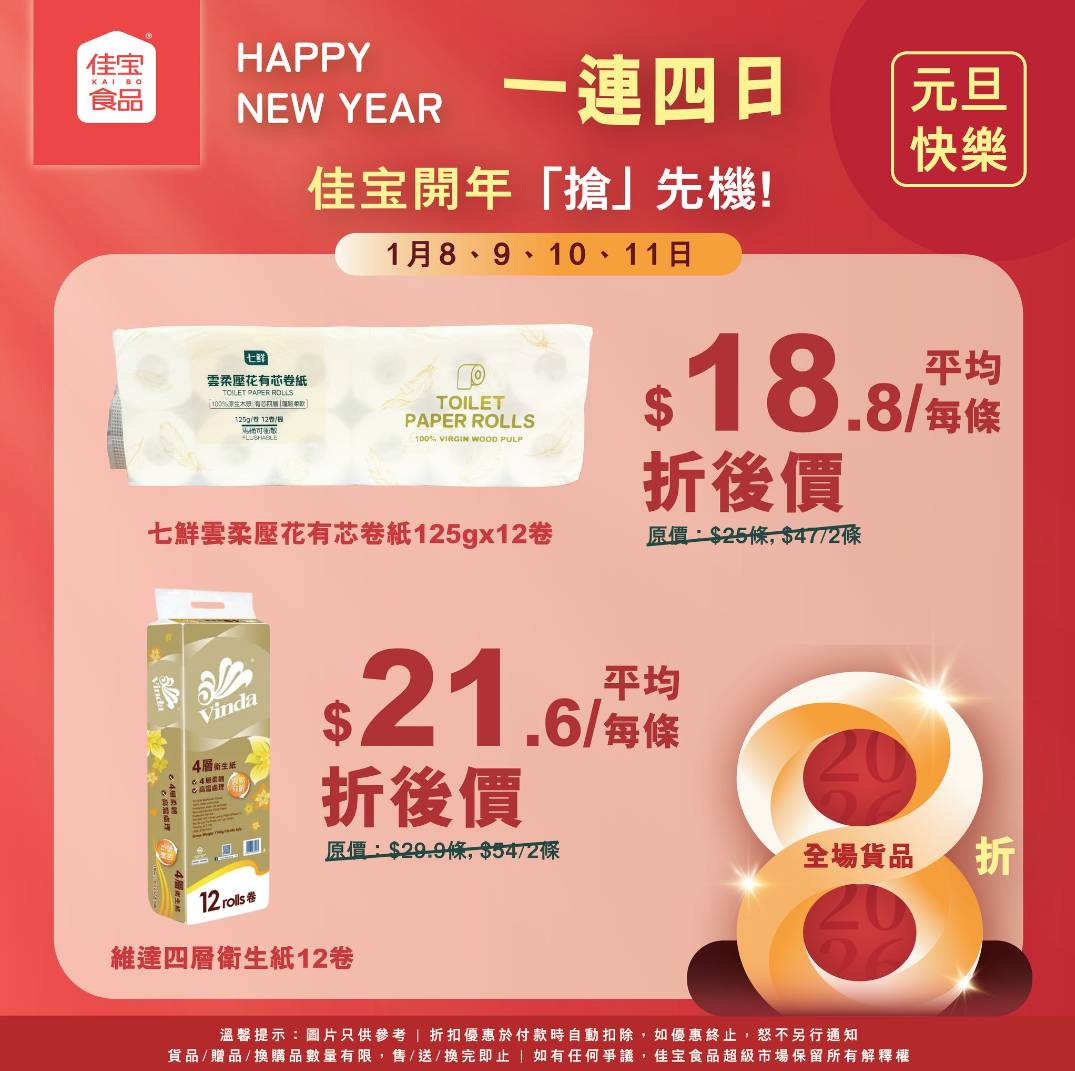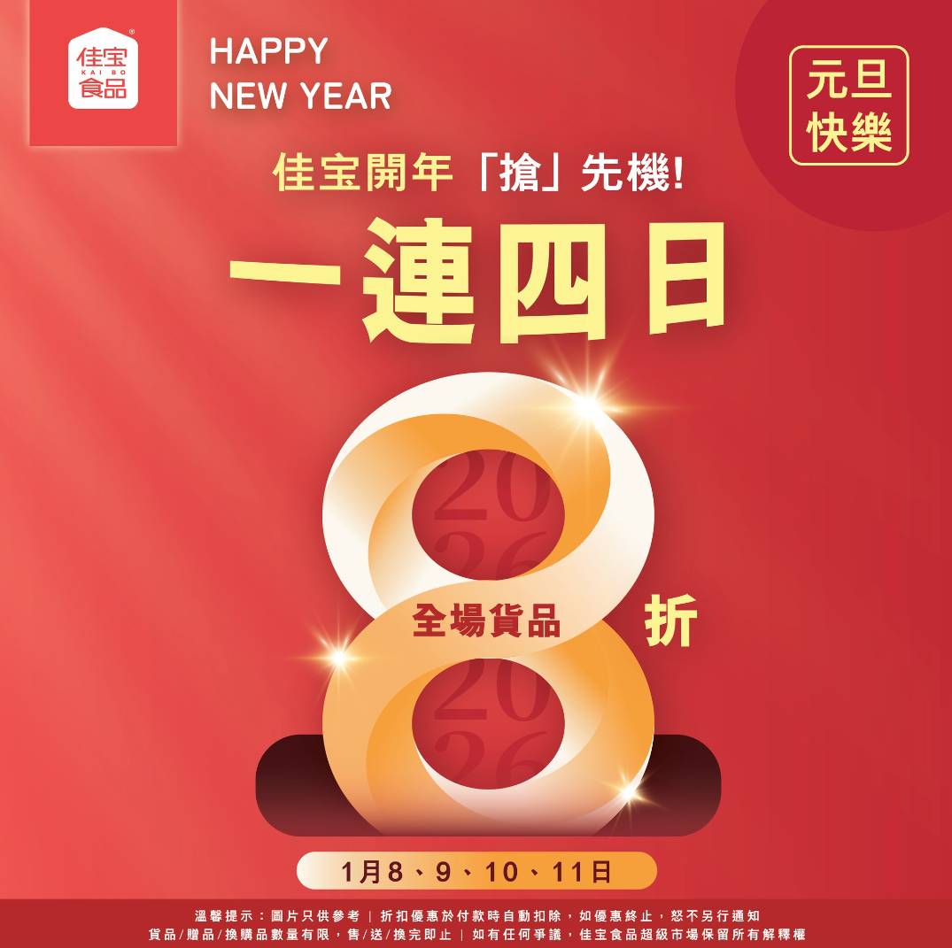 佳宝食品於昨日(1月8日)起推出2026年首個全場8折優惠,優惠活動為期4日,至1月11日(星期一)結束,適用於全線分店,唯獨海濱花園分店除外。是次優惠涵蓋所有貨品,折扣於付款時自動扣除,讓市民可以更優惠價錢購買日常所需。活動推出首日已吸引大批市民到場搶購,多款熱門貨品銷情理想。
