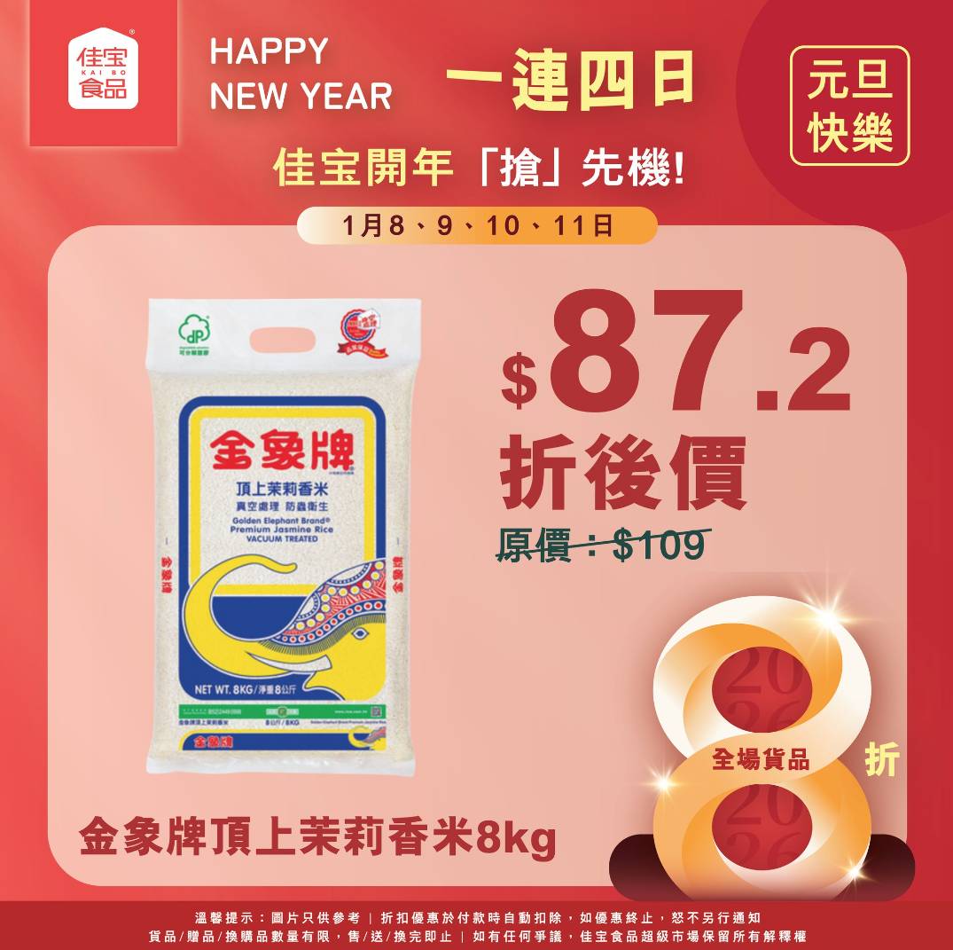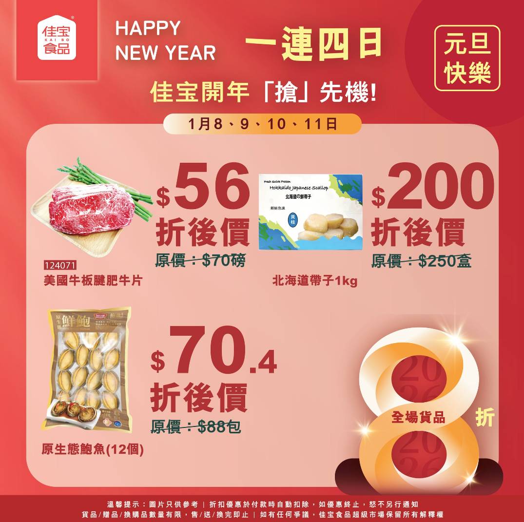 佳宝食品超級市場正進行開年首個重磅優惠,全場貨品一律8折,由昨日1月8日起一連4日於全線分店推出,當中多款精選貨品折後價錢極之吸引。金像牌頂上茉莉香米8公斤裝僅售87.2元、美國牛板腱肥牛片每磅56元、北海道帶子1公斤裝200元,絕對是市民入貨的黃金機會。