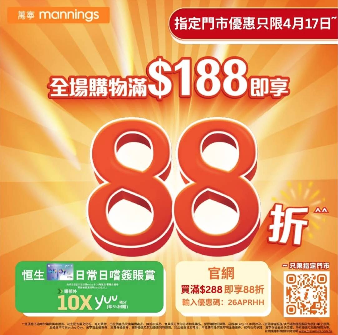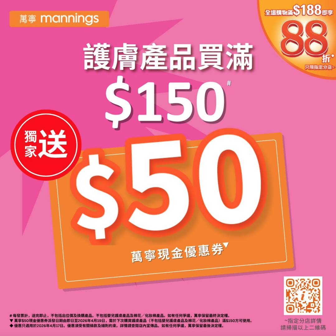 萬寧則設定較高門檻,今日於指定門市單一消費滿188元方可享88折,建議消費者集中選購洗髮露、沐浴露、紙巾及常備藥物等家庭衛生及護理用品,以較低成本一次性補足存貨需求。至於萬寧網店,買滿$288再輸入優惠碼「26APRHH」即享88折。此外,購買任何護膚品滿$150 即送$50萬寧現金優惠券。