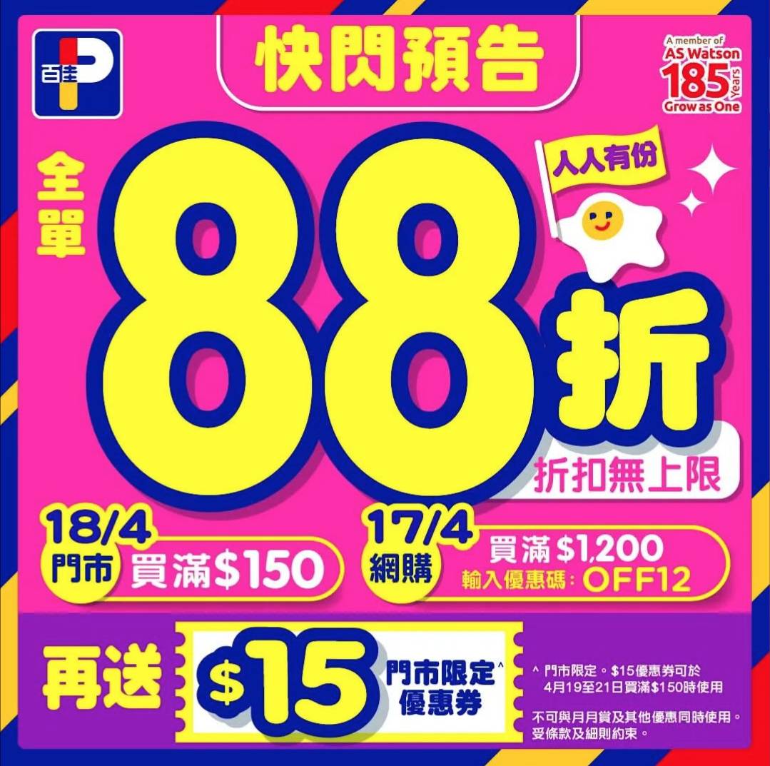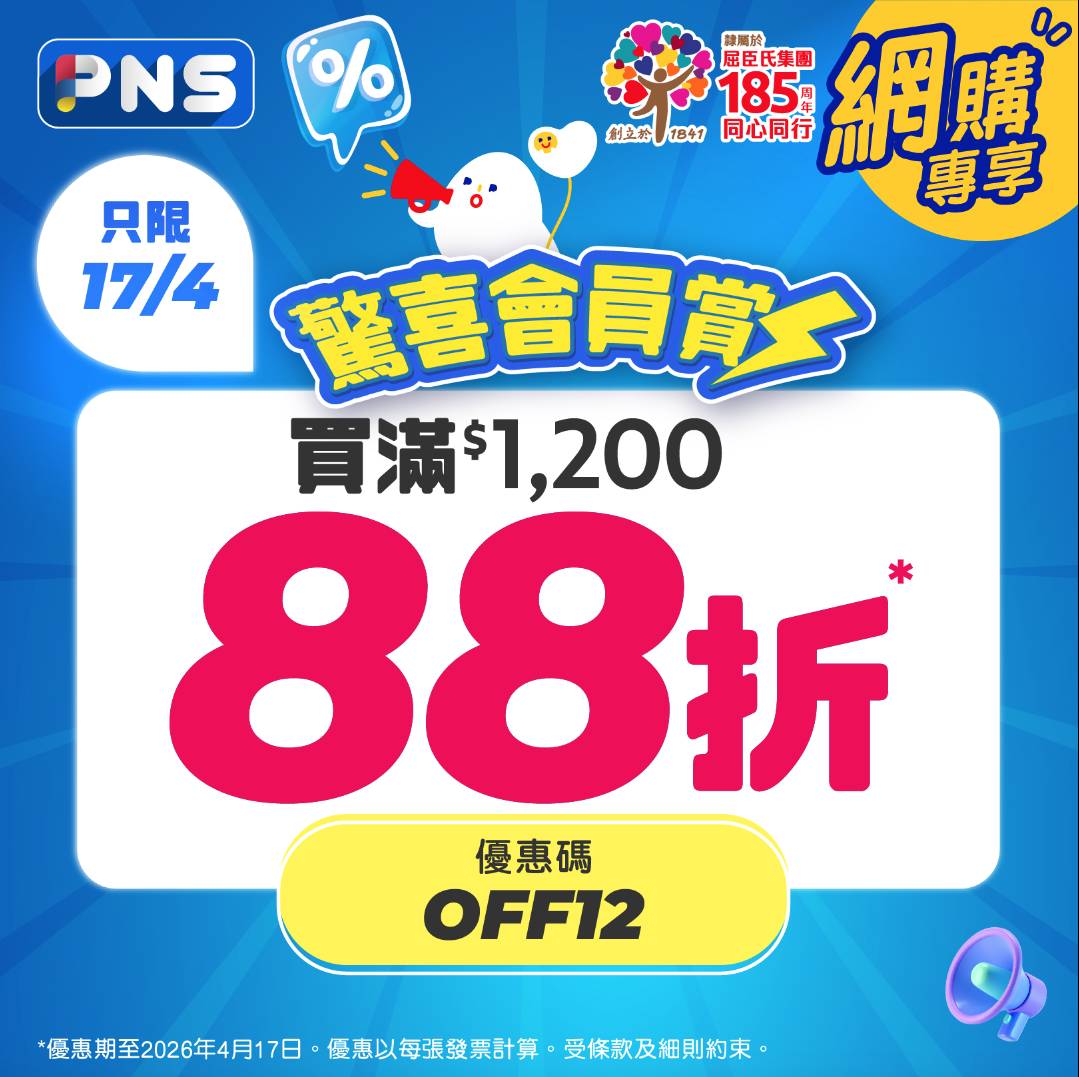 百佳PNS平台於4月17及4月18日(星期五及星期六)推出大額優惠,單一訂單消費滿$1,200元並輸入優惠碼「OFF12」,即享全單88折,適合需要大量入貨或與家人分攤購物費用的消費者。