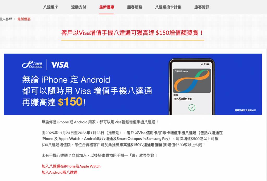 近日推出「手機八達通客戶增值獎賞推廣活動」,由即日起至2026年1月23日,手機八達通現有或新客戶透過Visa信用卡或扣賬卡增值,即可賺取現金回贈。每位合資格用戶最高可獲150元現金回贈,名額有限先到先得,想賺盡回贈就要把握時機。