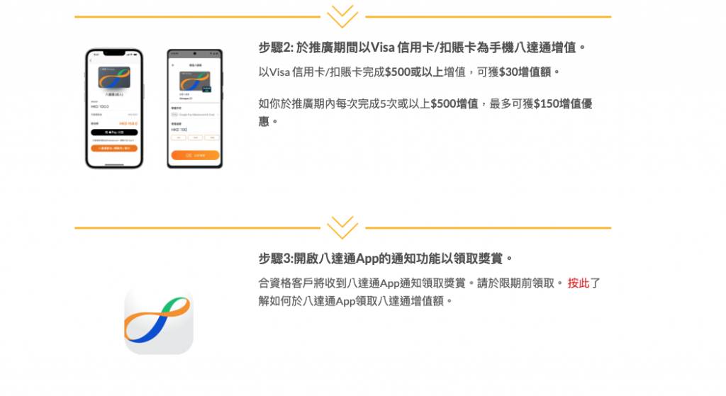 今次八達通優惠適用範圍相當廣泛,包括iPhone、Apple Watch內的八達通、Android版八達通,以及Smart Octopus in Samsung Pay。用戶只需在推廣期內,以Visa信用卡或扣賬卡為手機八達通單次增值滿500元或以上,即可獲贈30元八達通增值額。每位用戶於推廣期內最多可享用此優惠5次,即是累積回贈可達150元。不過要留意,活動並不適用於透過「旅客八達通App」加入的八達通,以及透過八達通App加入的Citi八達通。