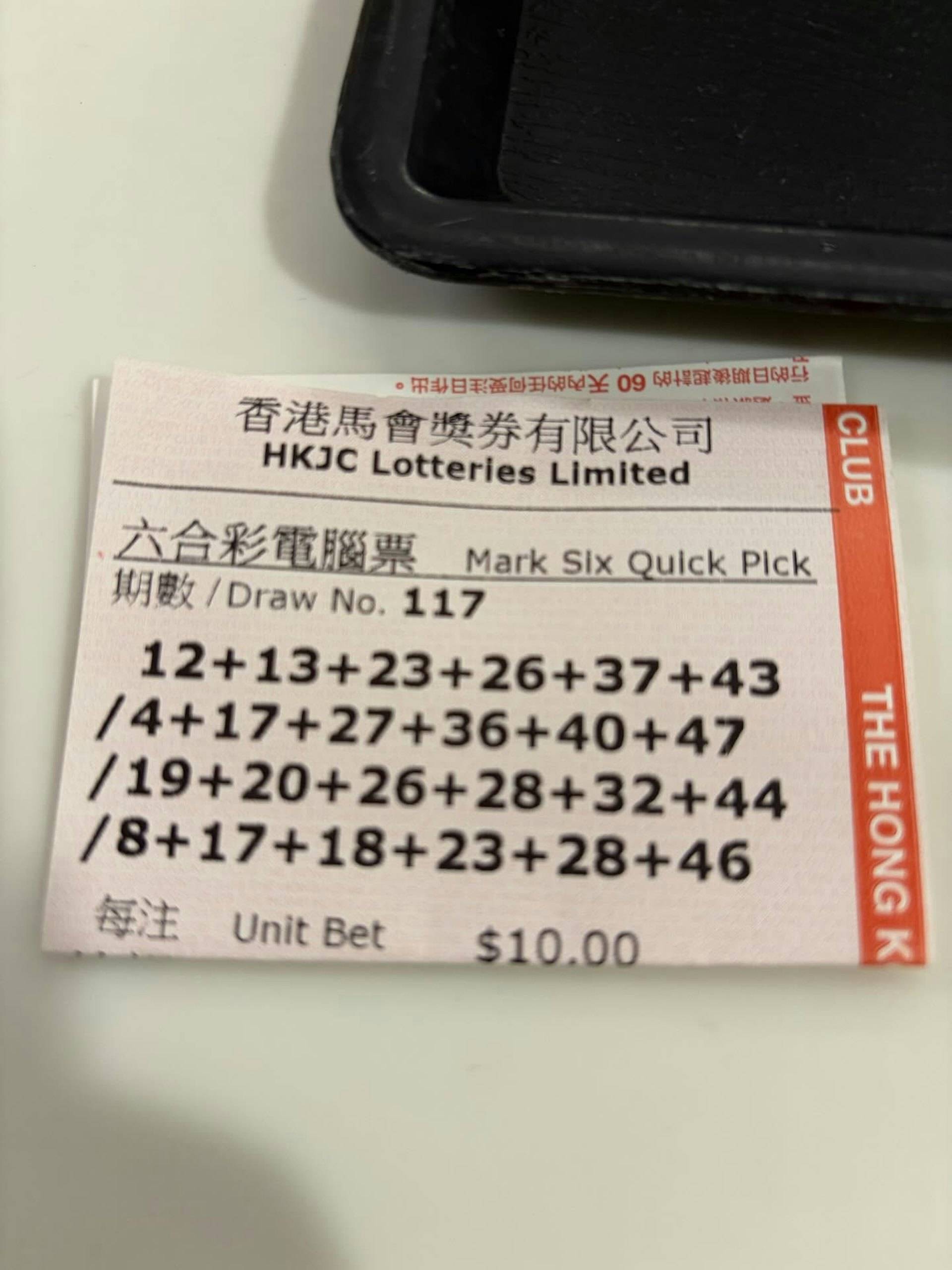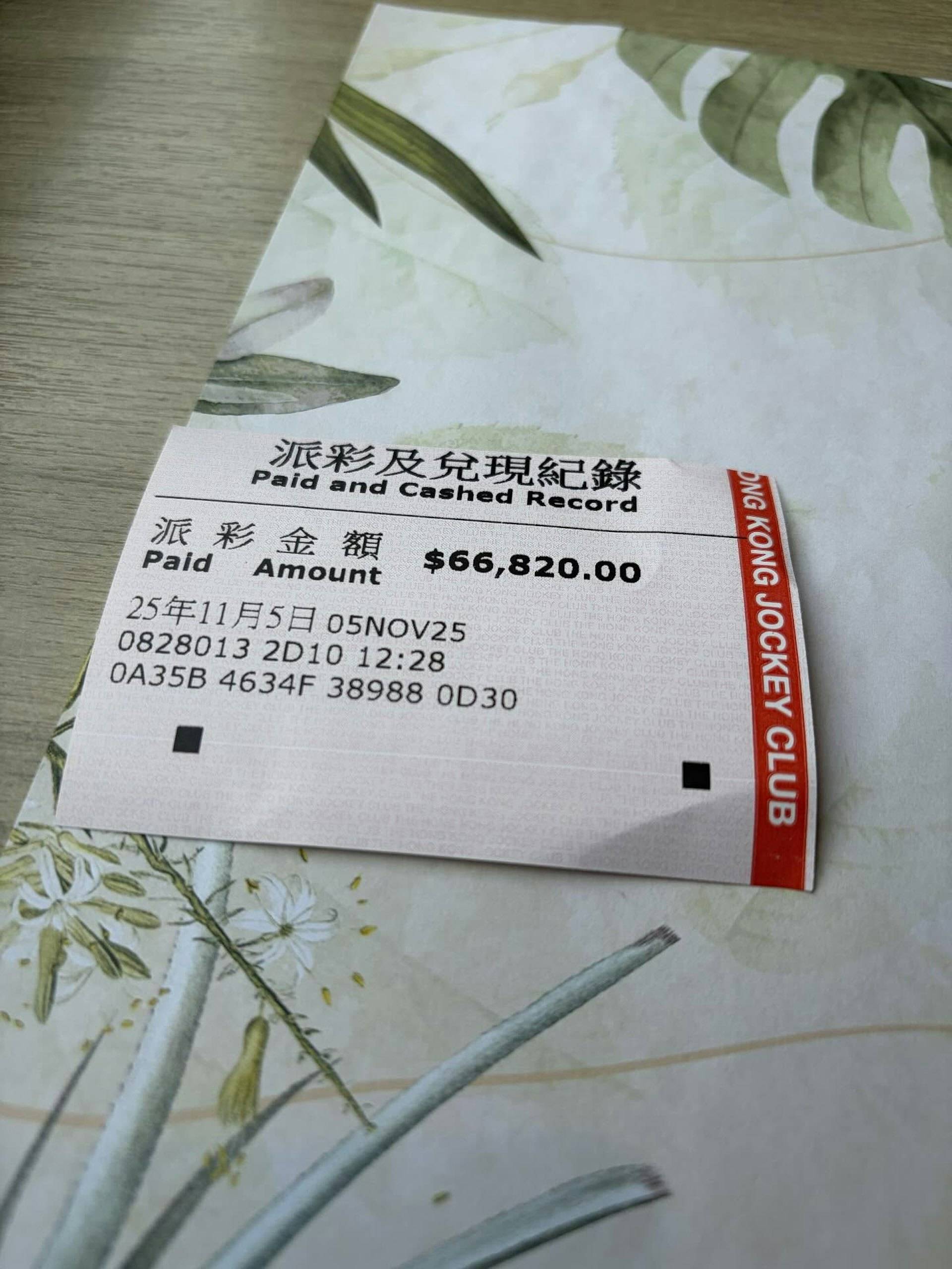 該名幸運兒在threads上載11月4日的投注紀錄,顯示他當日花費40元購買4注六合彩,其中1注巧中5個攪出號碼,分別是19、20、26、28及44,不包括特別號碼4,成功中得1注三獎。當晚六合彩攪珠結果為19、20、26、28、39、44,特別號碼為4,而他的其他3注投注都沒有中另一個攪出號碼39。馬會公布當期三獎共有242注中獎,每10元一注派彩66,820元。