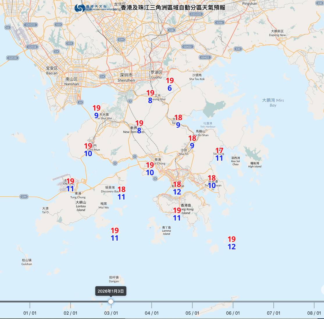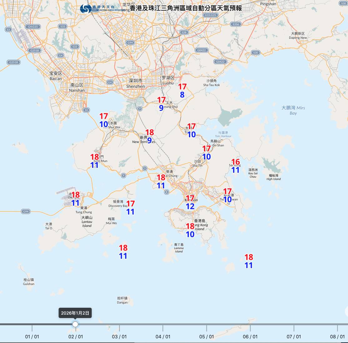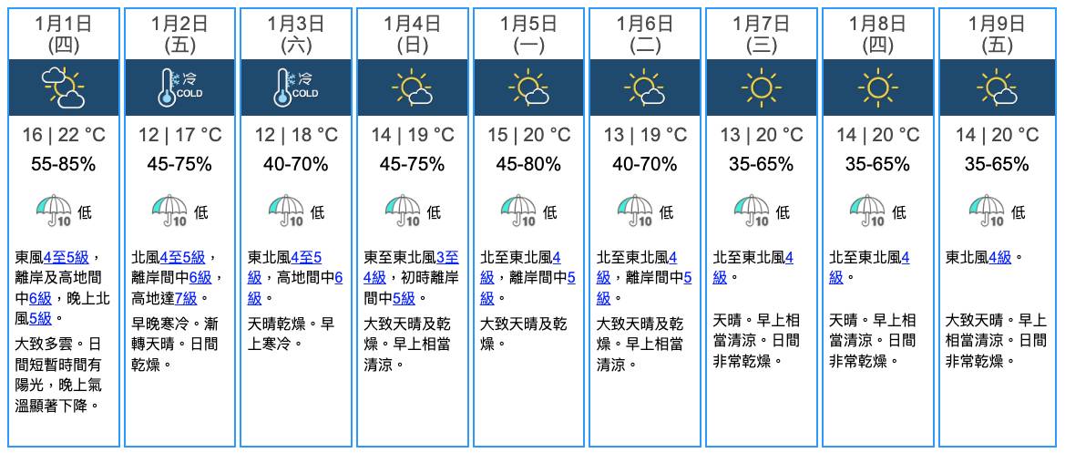 據天文台九天天天氣預測,星期五(1月2日)及星期六(1月3日)氣溫顯著下降,天氣轉冷,周五氣溫介乎12至17度,周六最高氣溫略有回升至18度,日夜溫差較大。按自動分區天氣預報顯示,周五打鼓嶺氣溫低見8度,而翌日氣溫進一步下跌至6度。隨後星期日1月4日至9日氣溫稍微上升,最低溫約13、14度,最高溫度為19、20度。天文台在《新年初始,寒潮寫序》的天氣隨筆中指出,元旦後一兩日本港市區的最低氣溫下降至11、12度左右,新界部分地區達嚴寒水平,風寒效應亦會較為明顯。