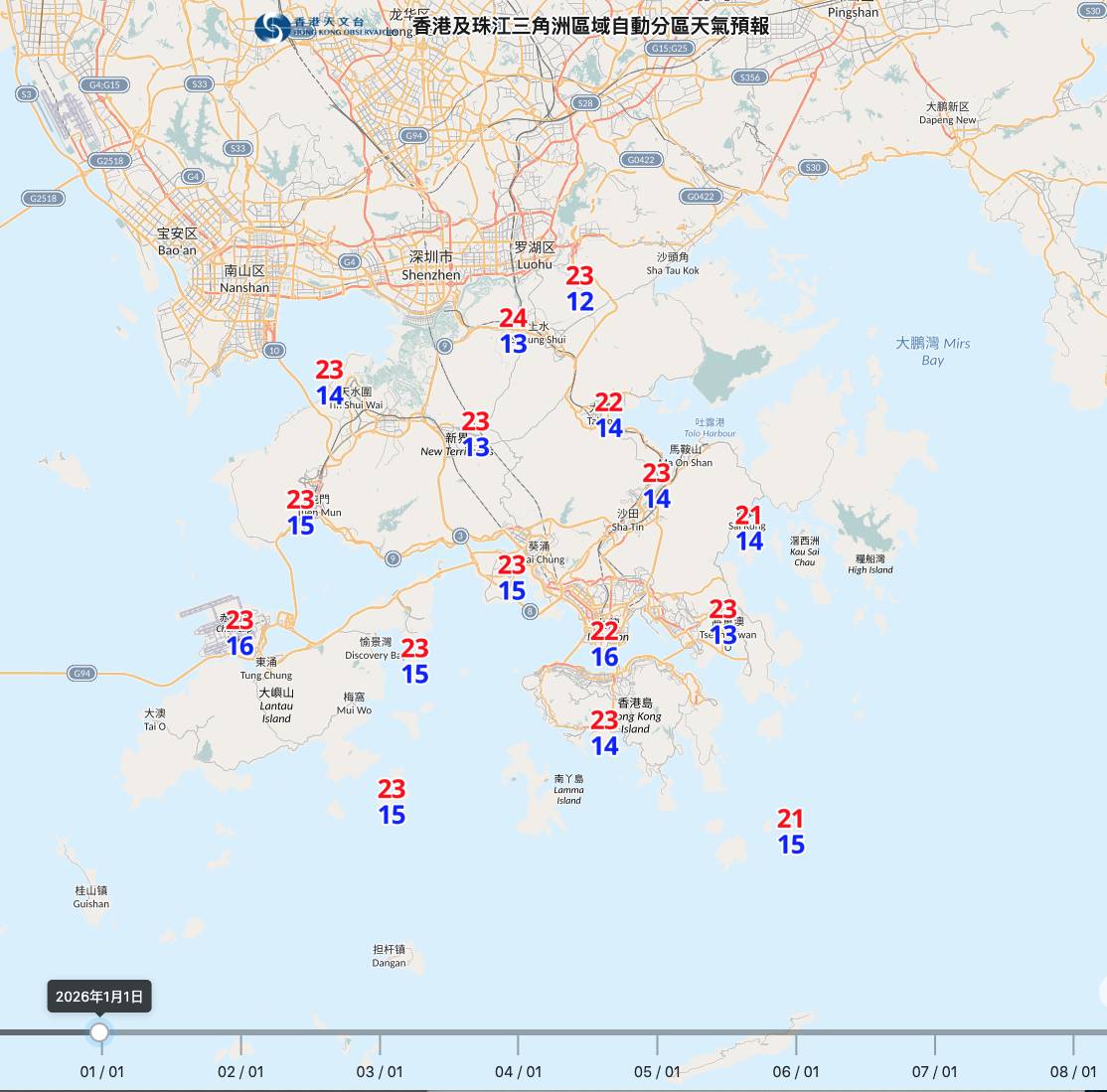 元旦日(2026年1月1日)天氣將出現明顯轉變,天文台預測當日大致多雲,短暫時間有陽光,風勢頗大,晚上轉吹北風,氣溫約16至22度。一道冷鋒會在元旦稍後橫過沿岸地區,受隨後的冬季季候風影響,該區北風增強,隨後一兩日氣溫顯著下降。按元旦日當日最高氣溫22度計算,一夜之間氣溫可跌10度,溫差變化相當極端。