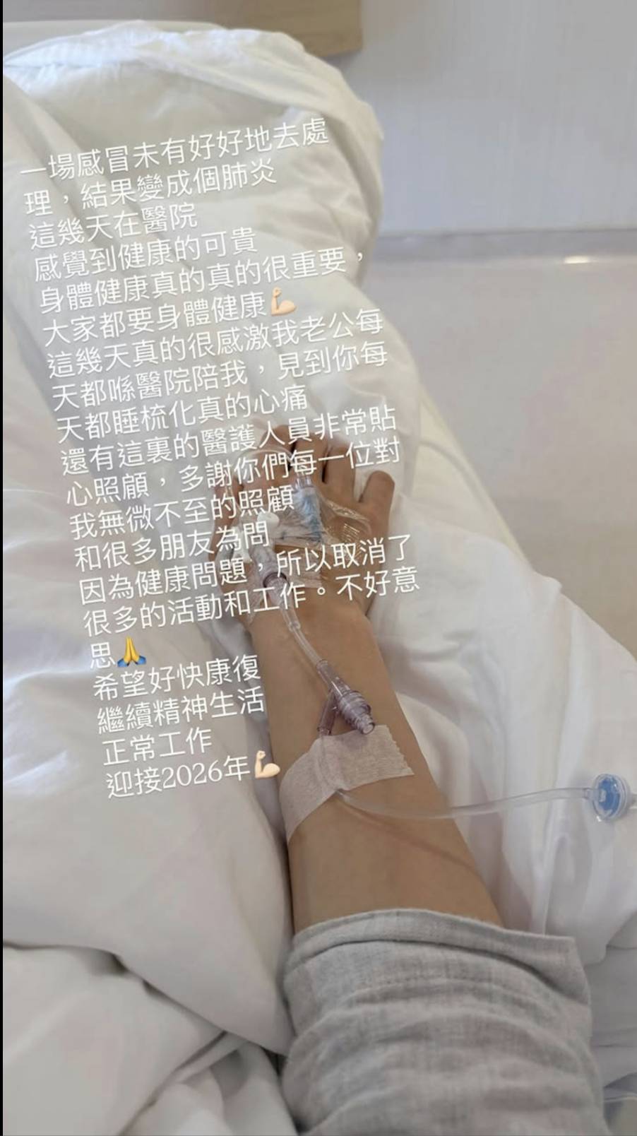 感冒 肺炎︱46歲周勵淇(Niki)昨日(20日)突然在社交平台的限時動態上載病床照,透露因感冒處理不當演變成肺炎需要住院治療,右手插著喉管的畫面令人心痛。她亦交代自己最新的病況。期間,周勵淇更感謝老公傅浤鳴連日來在醫院陪伴照顧,令她非常感動。