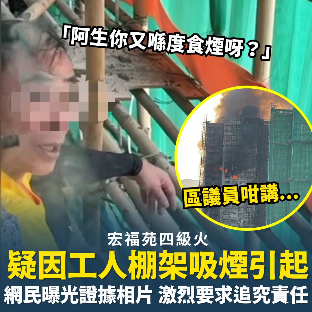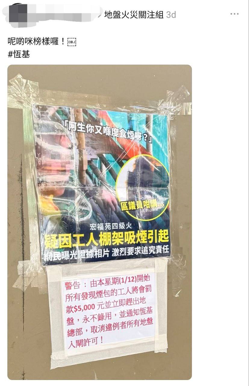 除了口頭警告,有地盤更以海報形式發出禁煙令。網民在社交媒體分享一張地盤的最新禁煙公告,告示上方印有工人在棚架上吸煙的海報,並寫上「阿生你又喺度食煙呀?」及「宏福苑四(五)級火,疑因工人棚架吸煙引起,網民曝光證據相片,激烈要求追究責任」等字句。海報下方的警告表示,由12月1日開始,所有發現煙包的工人將會罰款5,000元,並立即趕出地盤,永不錄用,並通知總部,取消違例者所有地盤入閘許可。措施嚴厲程度史無前例,工人即使未被捉到吸煙,單是身上帶有煙包已被視為違規。
