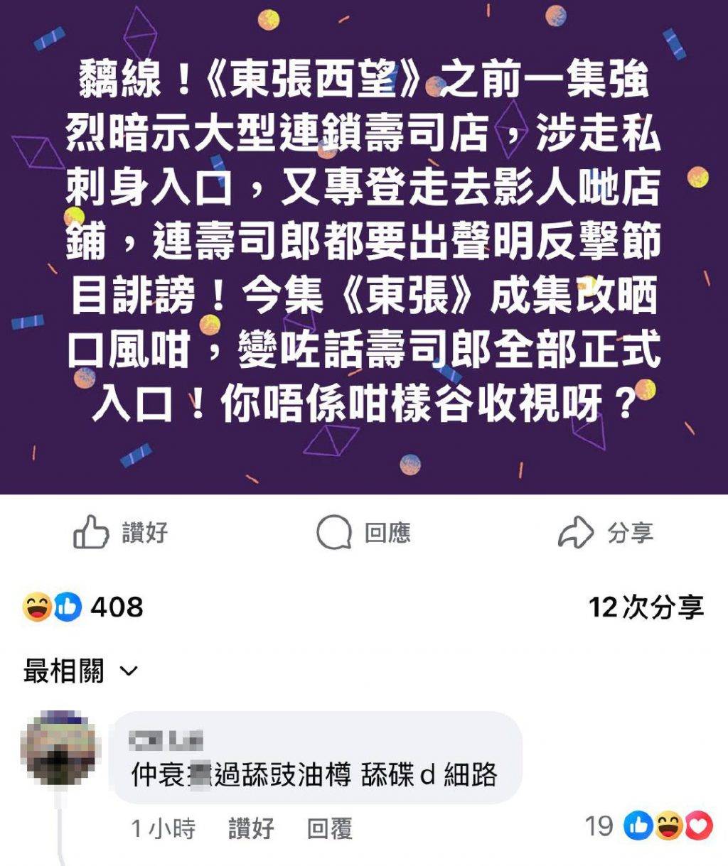 一眾評論火力全開:「根本就係借壽司郎個名 make noise」、「tvb攞明知唔關壽司郎事,但就強烈影射佢有事黎谷收視,一貫卑鄙做法,惡慣呀嘛,希望壽司郎今鋪企硬告佢」、「仲夠膽死話人哋九月份已經書面澄清過一次,咁點解琴日嗰集節目完全唔提?」更有人直言:「仲衰過舔豉油樽,舔碟d 細路」。