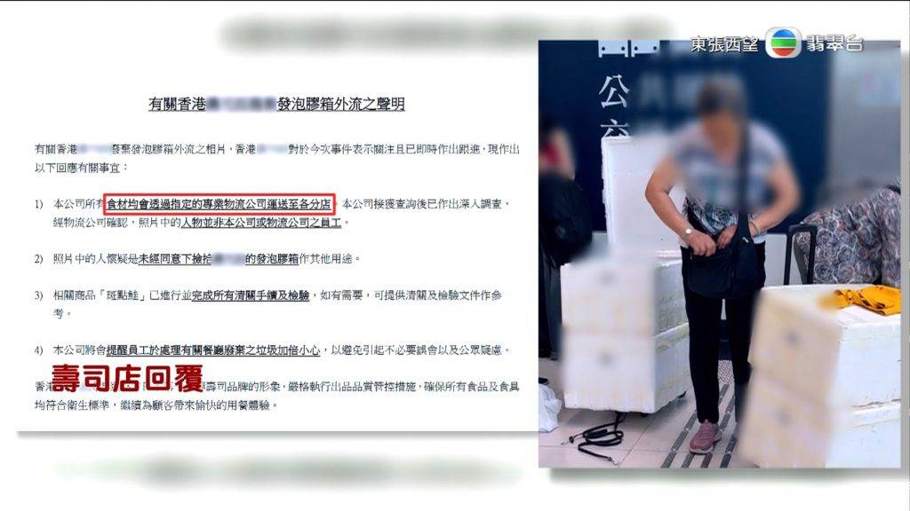 主持區永權承認早於9月已收到壽司店回覆,強調食物均由指定物流公司運送指分店,懷疑照片中的人是「未經同意下撿拾壽司郎的廢棄發泡膠箱作其他用途」,以後會提醒員工要加倍小心處理垃圾。而嘉賓陳貝兒接着表示:「到咗11月1號,壽司店透過公關致電我哋,話日本母公司方面好關注事件。」海關亦表示會密切留意水貨活動,並會針對相關走私活動進行調查。