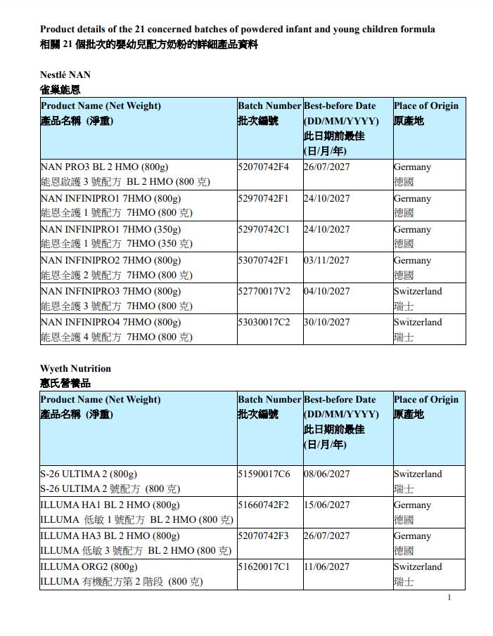 食物安全中心透過食物事故監測系統得悉,雀巢公司在歐洲因懷疑個別產品可能受到蠟樣芽孢桿菌污染,已自願回收部分批次的雀巢嬰兒配方奶粉。根據雀巢香港最新提供的資料,其進口本港的嬰幼兒配方奶粉有21個批次亦可能曾使用相關原材料,為審慎起見已自願停售受影響產品並展開預防性回收。受影響產品包括雀巢能恩啟護及全護系列、惠氏ILLUMA低敏、有機、LUXA及ATWO配方,以及S-26 ULTIMA系列,原產地分別為德國及瑞士。
