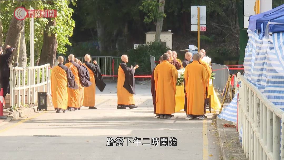 下午1時50分起,約20位佛教法師進入現場主持法事,祭壇上擺放著白色鮮花等祭品。法師們從2時開始一邊念誦經文,一邊敲打木魚,逝者家屬身穿黑衣在旁默哀。現場聚集了不少廣福邨街坊,部分人特意帶同白色菊花到場表達哀思。佛教頭七儀式完結後,下午約3時現場轉為進行道教儀式,近20名道士及相關人士主持法事,接著近100名家屬手持鮮花排隊向祭壇鞠躬上香,神情極為哀傷。