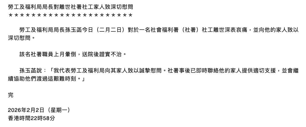 社會福利署回覆傳媒查詢時確認,上月確實有一名社署社工暈倒送院後證實不治。社署發言人表示:「對事件深表難過及惋惜,已即時聯絡其家人致以慰問,並會繼續為他們提供適切協助。」勞工及福利局局長孫玉菡今日亦就事件發聲,表示:「對於一名社署社工離世深表哀痛,並向他的家人致以深切慰問。」孫玉菡強調,代表勞福局向其家人致以誠摯慰問,社署會繼續協助家屬渡過這艱難時刻: