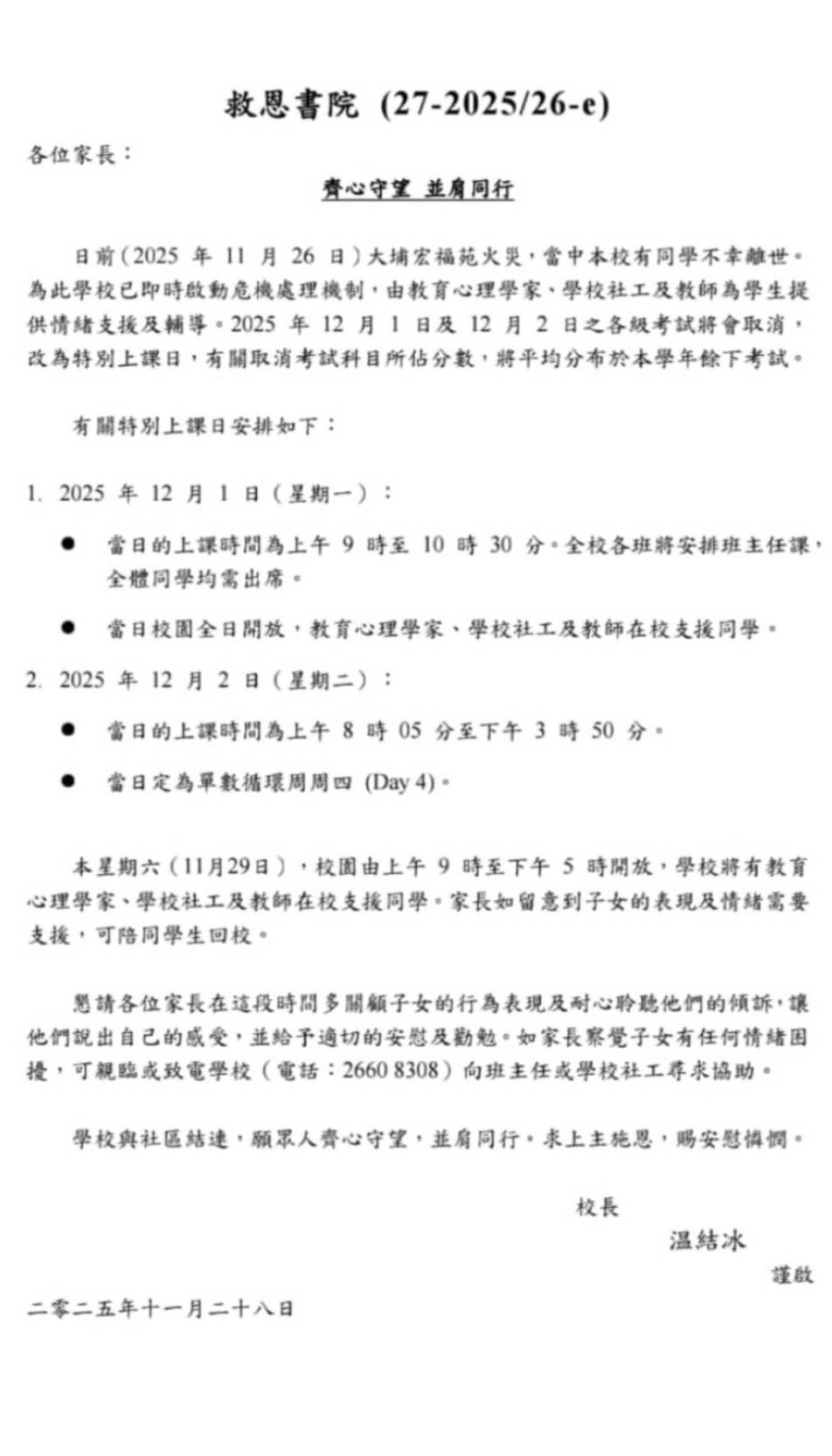 救恩書院(Kau Yan College,簡稱KYC)校長溫結冰於11月28日向家長發出通告,確認有一位學生於宏福苑火災中不幸離世。校方表示已即時啟動危機處理機制,由教育心理學家、學校社工及教師組成專業團隊,為全校學生提供情緒支援及心理輔導服務。溫結冰在信中指出,原定於12月1日及2日舉行的各級考試將全面取消,改為特別上課日,讓學校能夠專注於學生的心理健康需要。