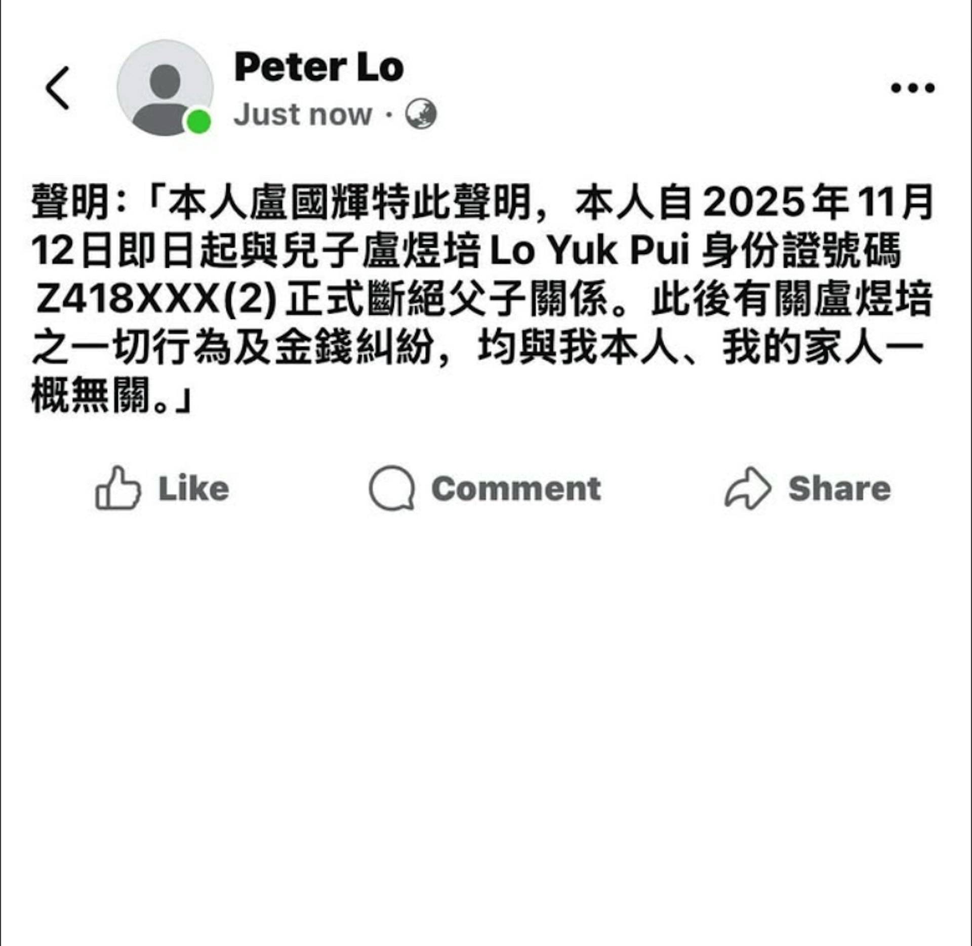 「本人盧國輝特此聲明,本人自2025年11月12日即日起與兒子盧煜培Lo Yuk Pui身份證號碼Z418XXX(2)正式斷絕父子關係。此後有關盧煜培之一切行為及金錢糾紛,均與我本人、我的家人一概無關。」