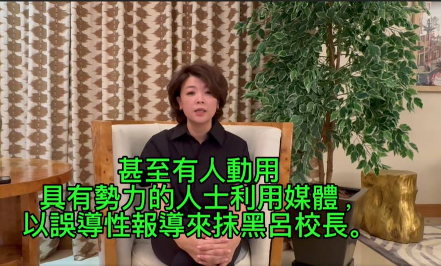 「在這段時間裡,我非常感激所有有心人及同行者對我和女兒處境的理解與關懷。我希望藉此機會,讓大家與我一同見證。近日,我看到不少針對我的攻擊性言論,甚至有人動用具影響力的人士利用媒體,以誤導性報導來抹黑呂校長。其目的只有一個——要我噤聲。這種行為令我深感恐懼。