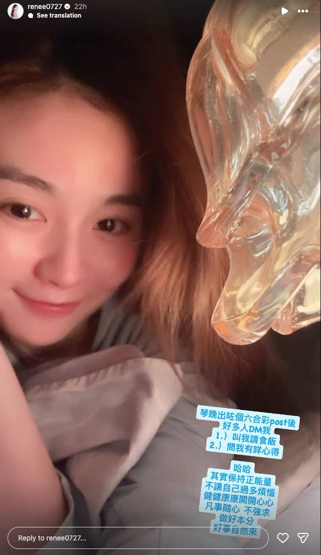李蘊中六合彩帖文備受關注,她其後再度發文,表示很多人詢問她中六合彩心得,「琴晚出咗個六合彩post後,好多人DM我,1.叫我請食飯,2.問我有咩心得」,她回答有5大秘訣,「哈哈 其實保持正能量 不讓自己過多煩惱 健健康康開開心心 凡事隨心不強求 做好本分 好事自然來」。