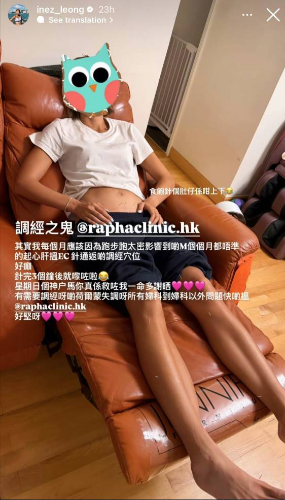 針灸照片,透露自己因為跑步過量導致經期紊亂,需要透過中醫調理身體。她更直言生完第二胎後身體明顯變弱梁諾妍曬針灸照自爆經期不準。梁諾妍日前在社交平台上載針灸照片,照片中她躺在梳化上接受針灸治療,針灸師在她的肚子和腳部位置施針。她在帖文中坦承自己每個月經期都不準時,懷疑與跑步訓練過於頻密有關。梁諾妍寫道: